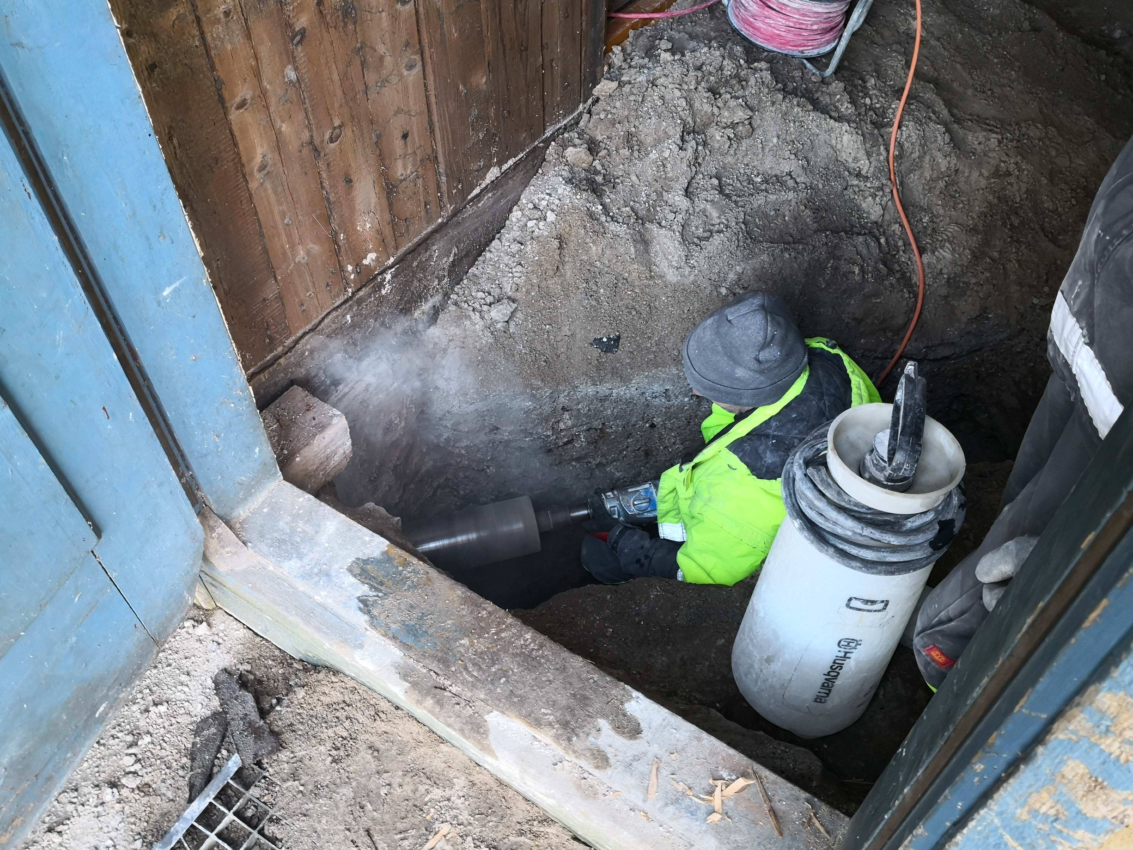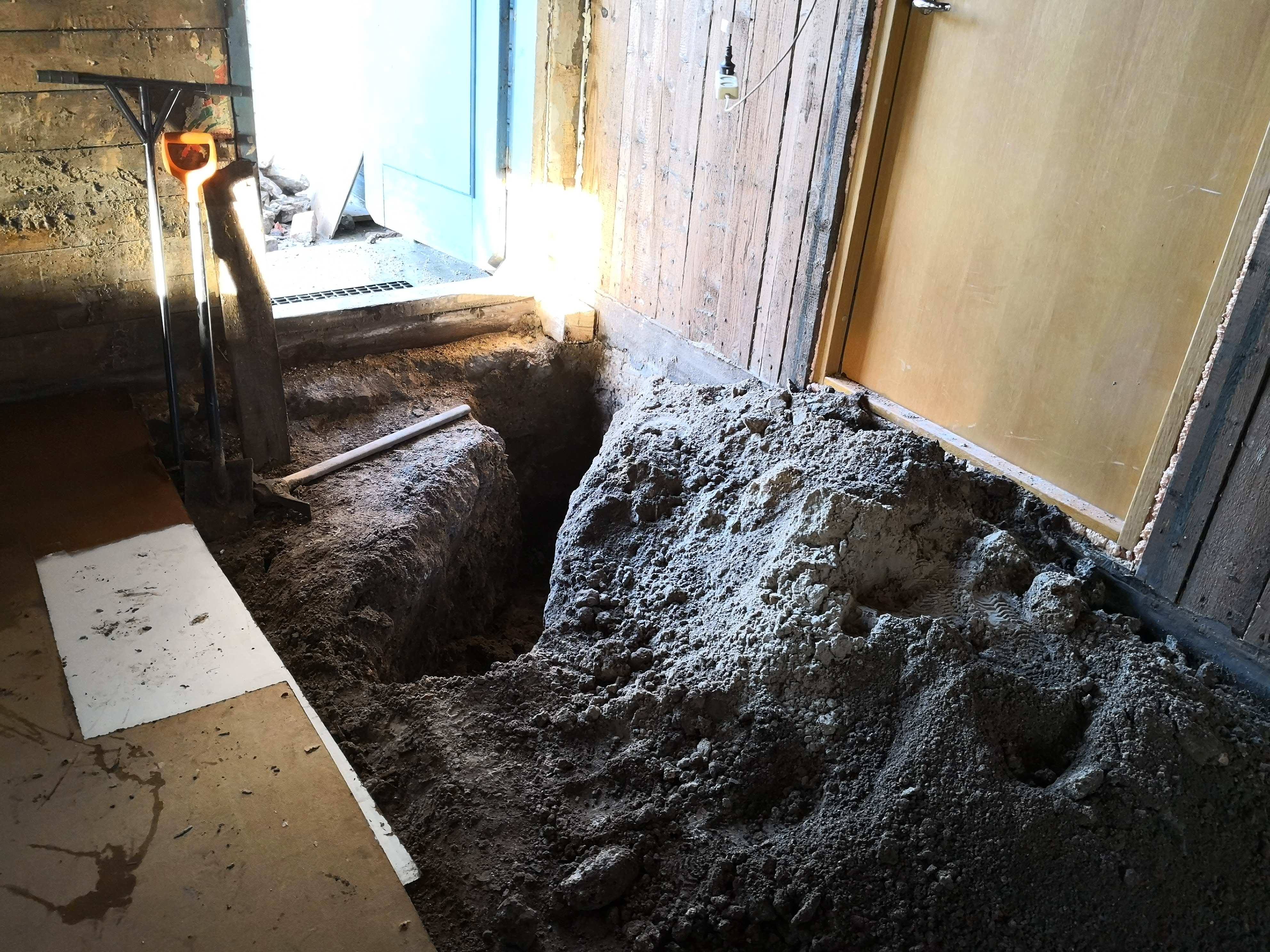 Monday afternoon we dug another test hole in the font yard to see if we could find the bottom of the foundation. There we also tried to drill some test holes. All in all it was not very successful. So we decided we would hire a company to drill a few holes through the foundation.