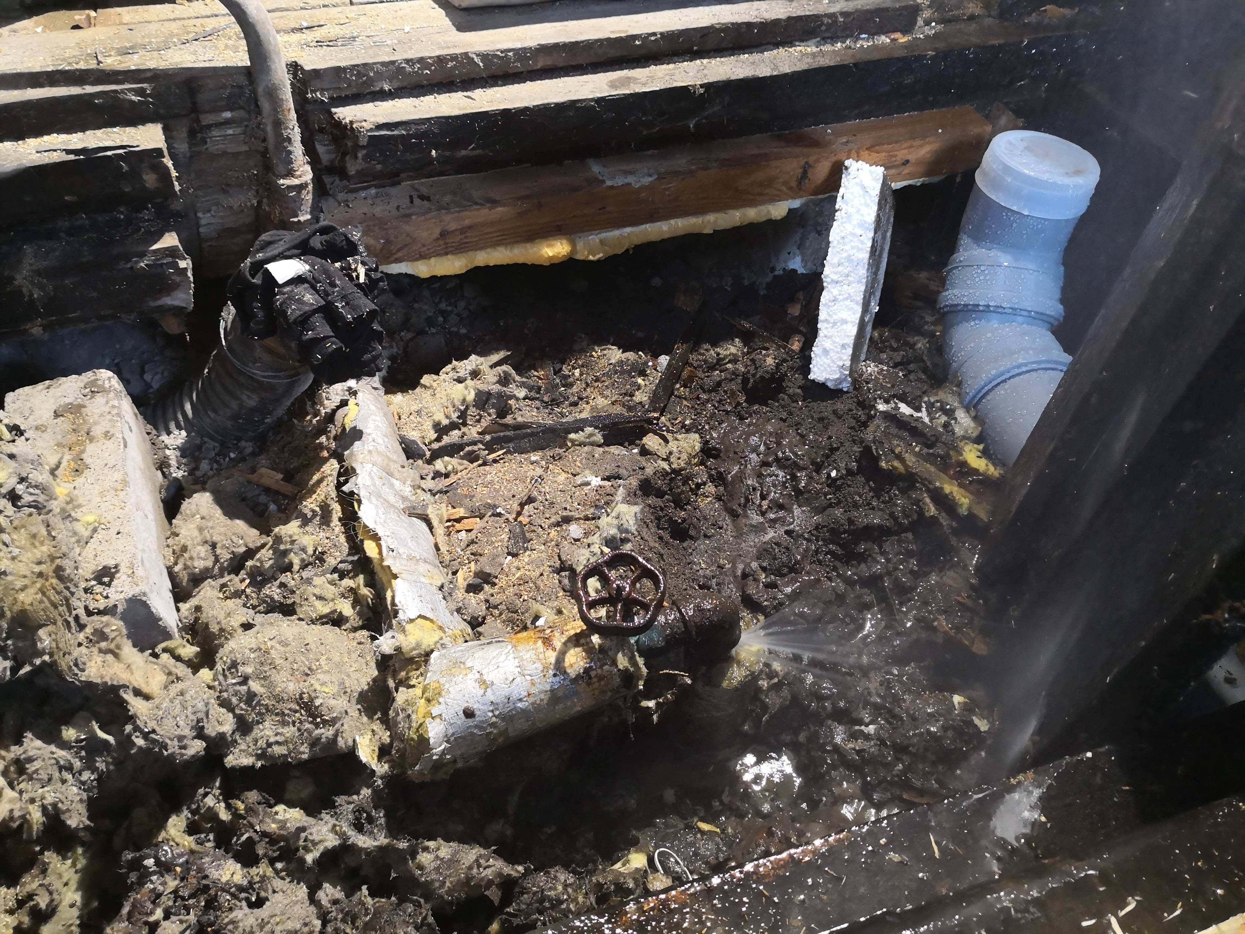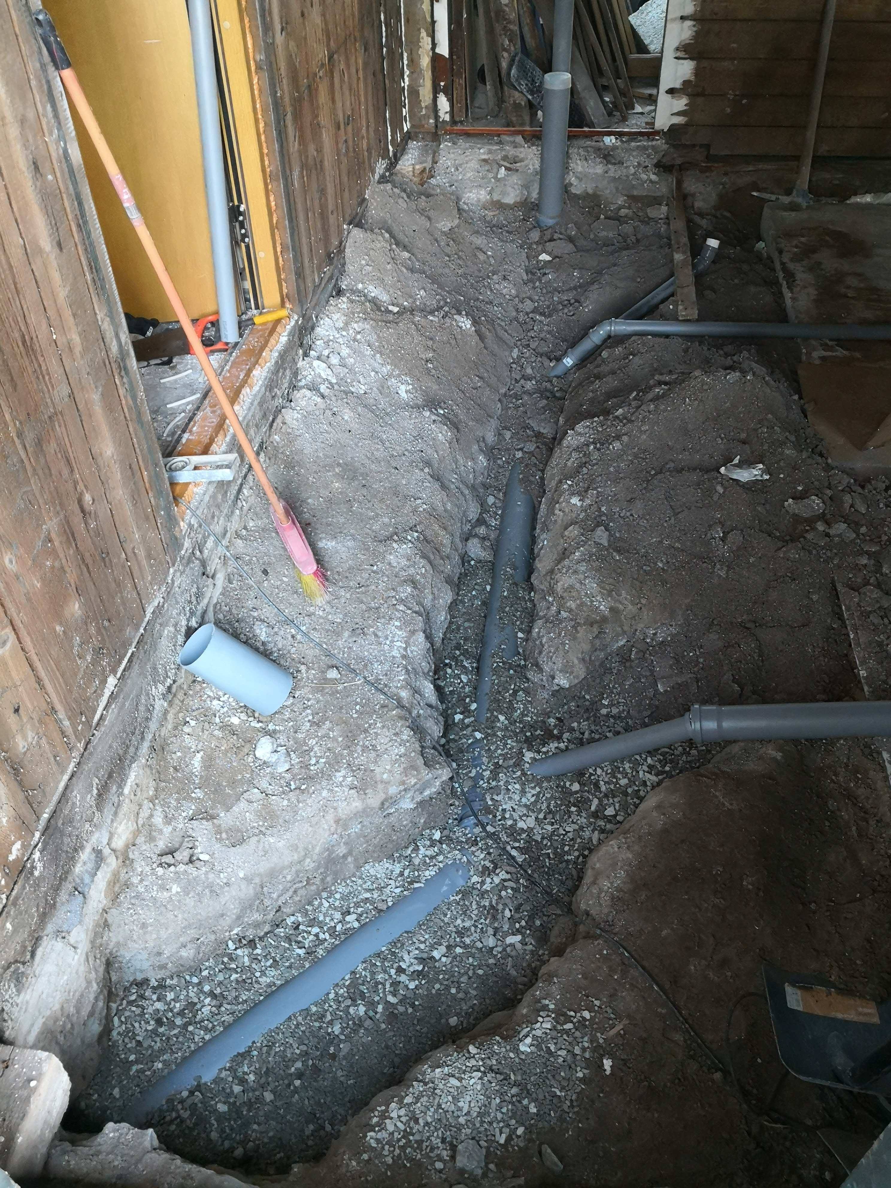 When she left to start preparing dinner, I was about done to put the floorboards in, I just needed to move the flexible pipe from the old sever system a bit down. While I worked on that the rusty water pipe broke just before the main tab and started a fine spray of water, which got bigger quickly. I put a piece of wood in front of it so the water would not spray all over the room. My dad came to help. I called Mo so she could call the water company to close the main tab in the street. Then i got some duck tape from the car to cover the hole as good as possible.