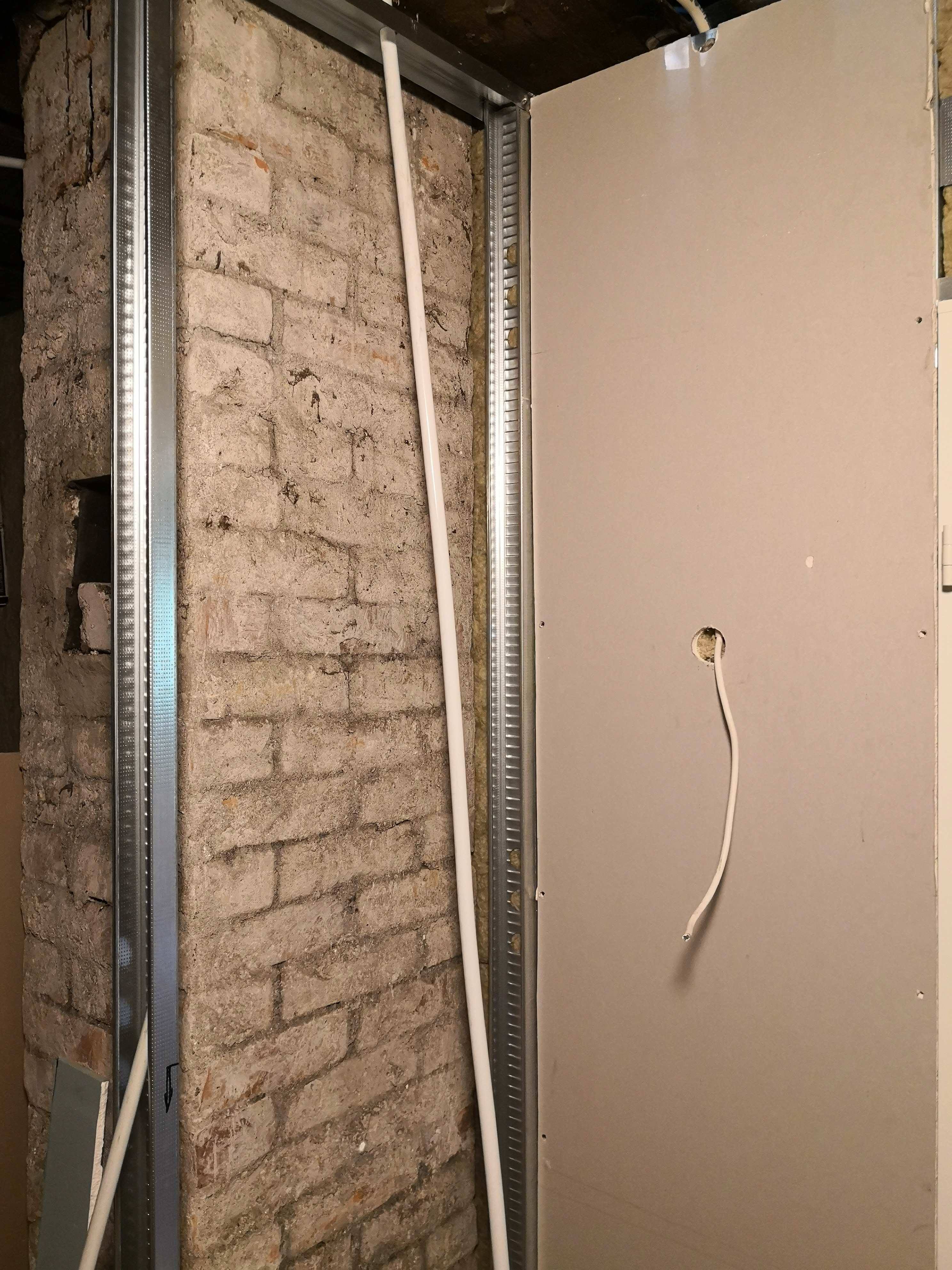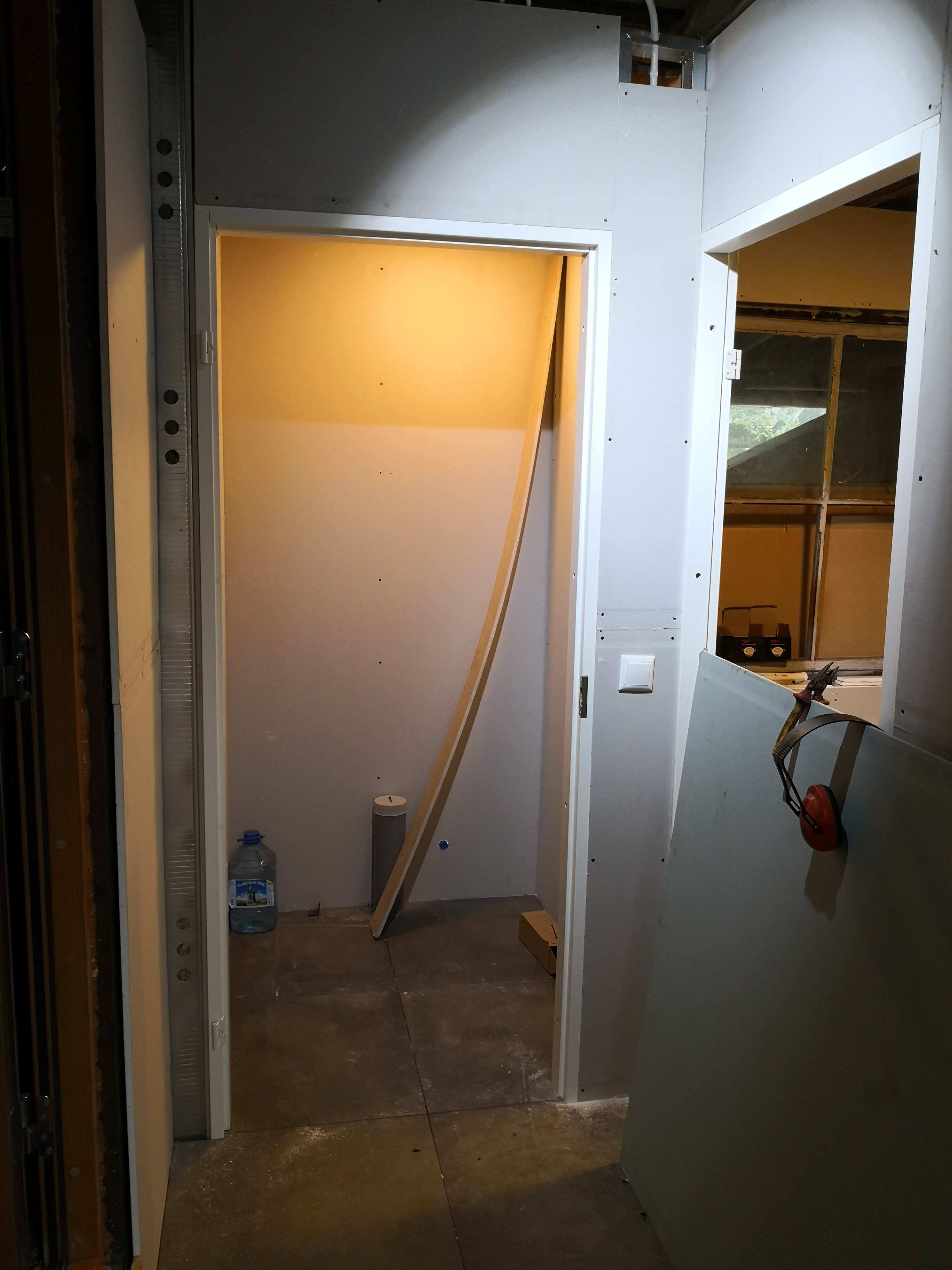 Uve said he would like to put a small switchboard for the boiler and the pumps, 1 x 10A and 3 x 6A, so I arranged a wire for the switchboard. This was a small task so after that I put in the door frame and wall for the toilet. Suddenly it is not the end of the hallway anymore, but an actual toilet. I also connected the switch and the light.