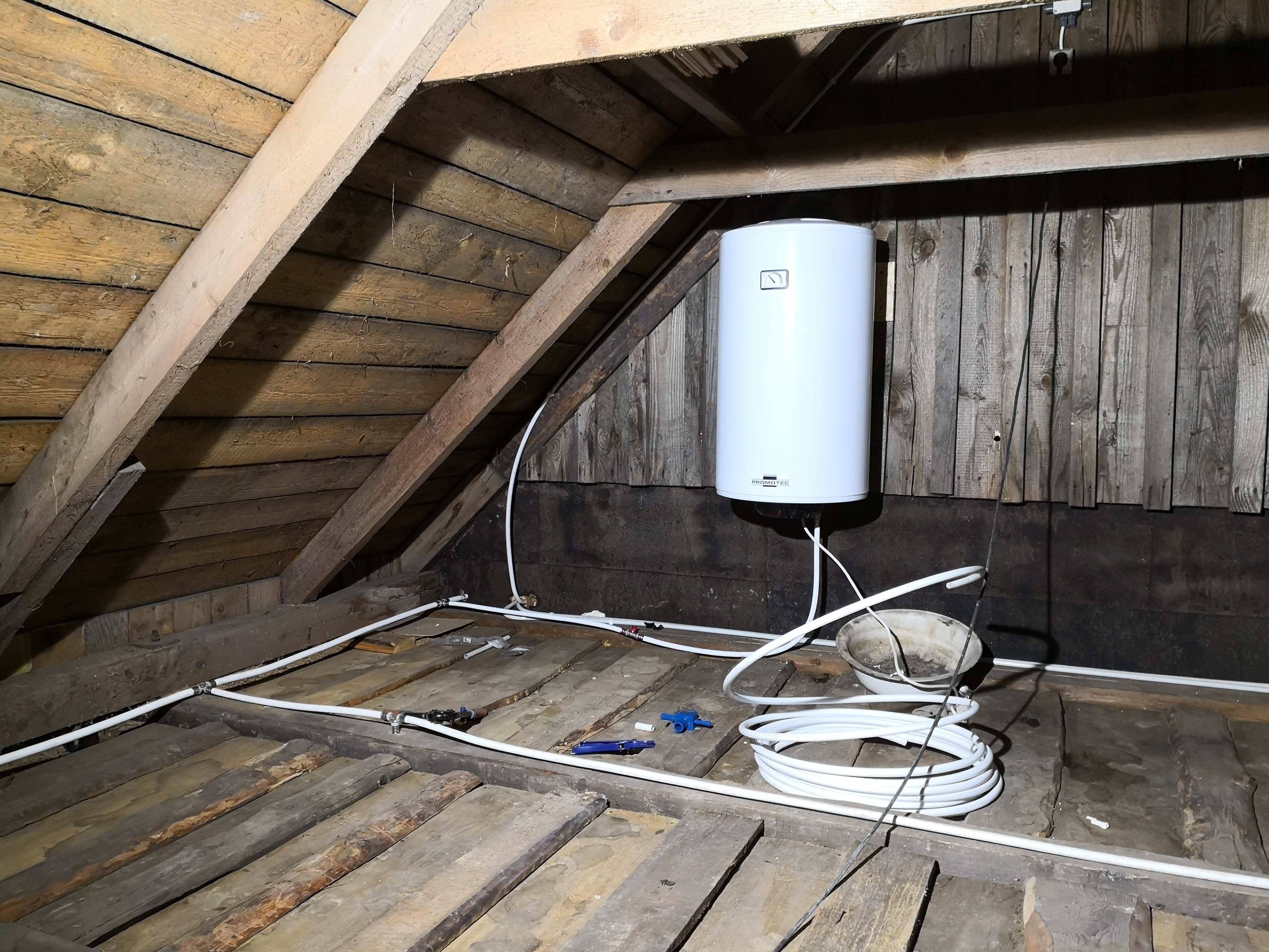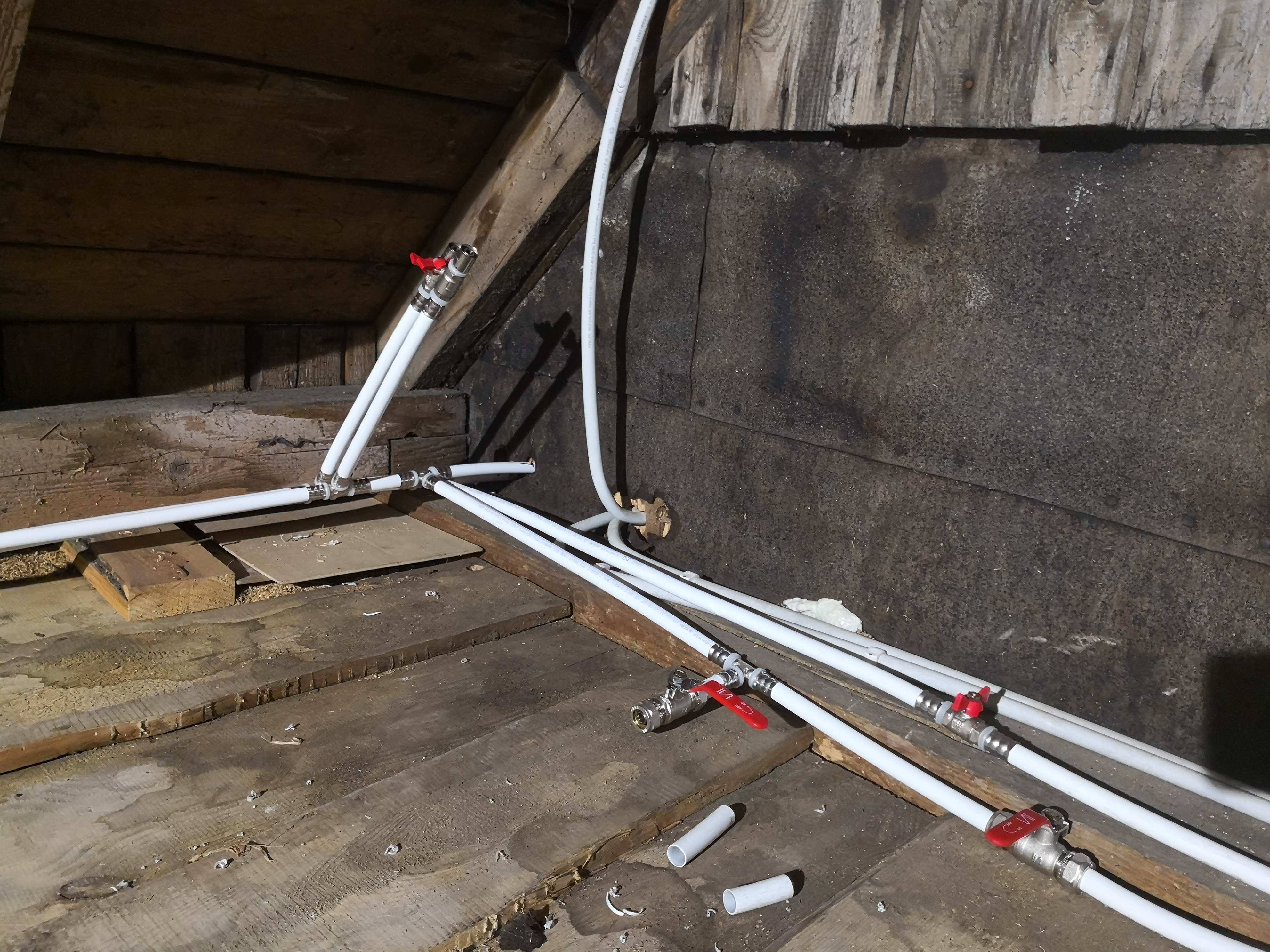 After I came in this morning, I started on finishing the water piping. The warm water pipes to be a bit more precise. I created a setup where the warm water system can be fed from two devices, the electrical boiler that was still in the house (and was bought very shortly before we bought the house) and the buffer that will be connected to the central heating, with some valves to switch between the two.