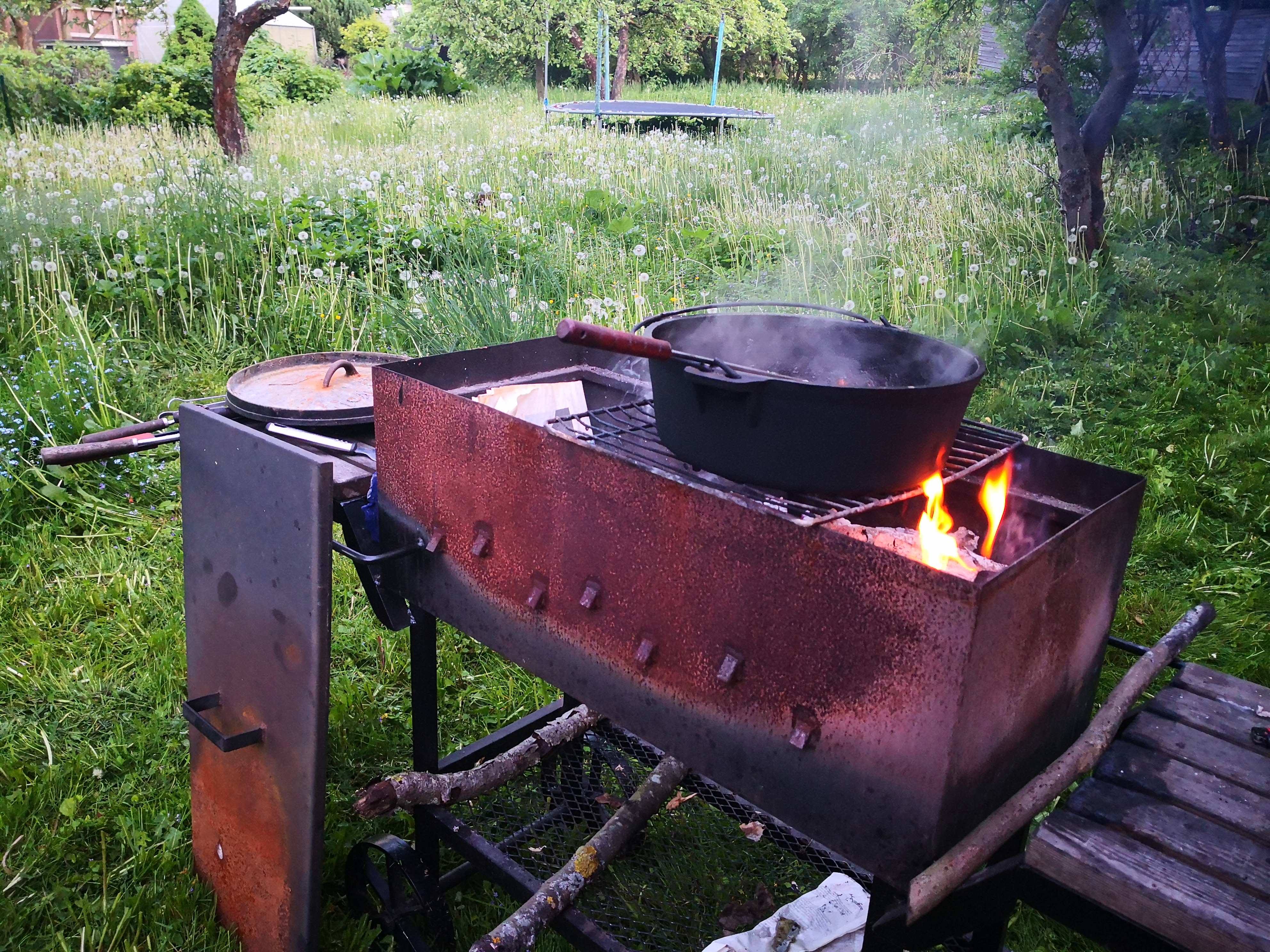 The next day we got back to actually do some mowing, but after it had been running for a few minutes, it started to run a bit more irregular. So Jeff and I took apart the carburetor and quickly found the problem, contamination in the carburetor. So soon it ran smooth again and Mo and I mowed about the first 10 meters of grass. This seemed plenty to us. Time for some food, this time I took out the dutch oven and put it on the fire to make a nice chili.
