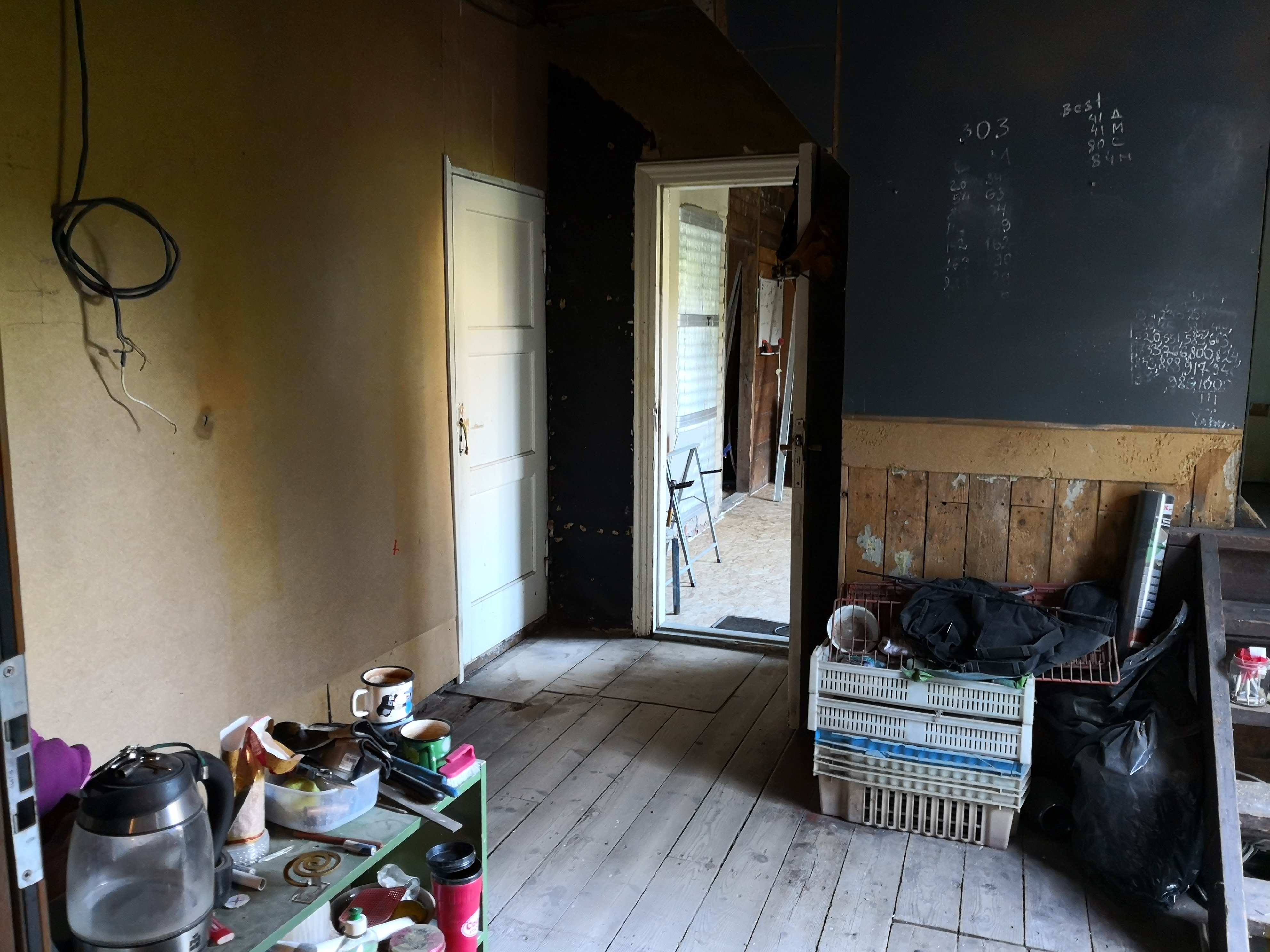 In the afternoon I got a phone call from Uve about the radiator in the hallway. In the last months a lot of stuff had accumulated, so I moved it outside and sorted it. I guess part of the wood will become the temporary kitchen later on. After that I took off the hardboard plates in the hallway. I still need to fill this side of the old kitchen door. But that is a nice job for tomorrow.