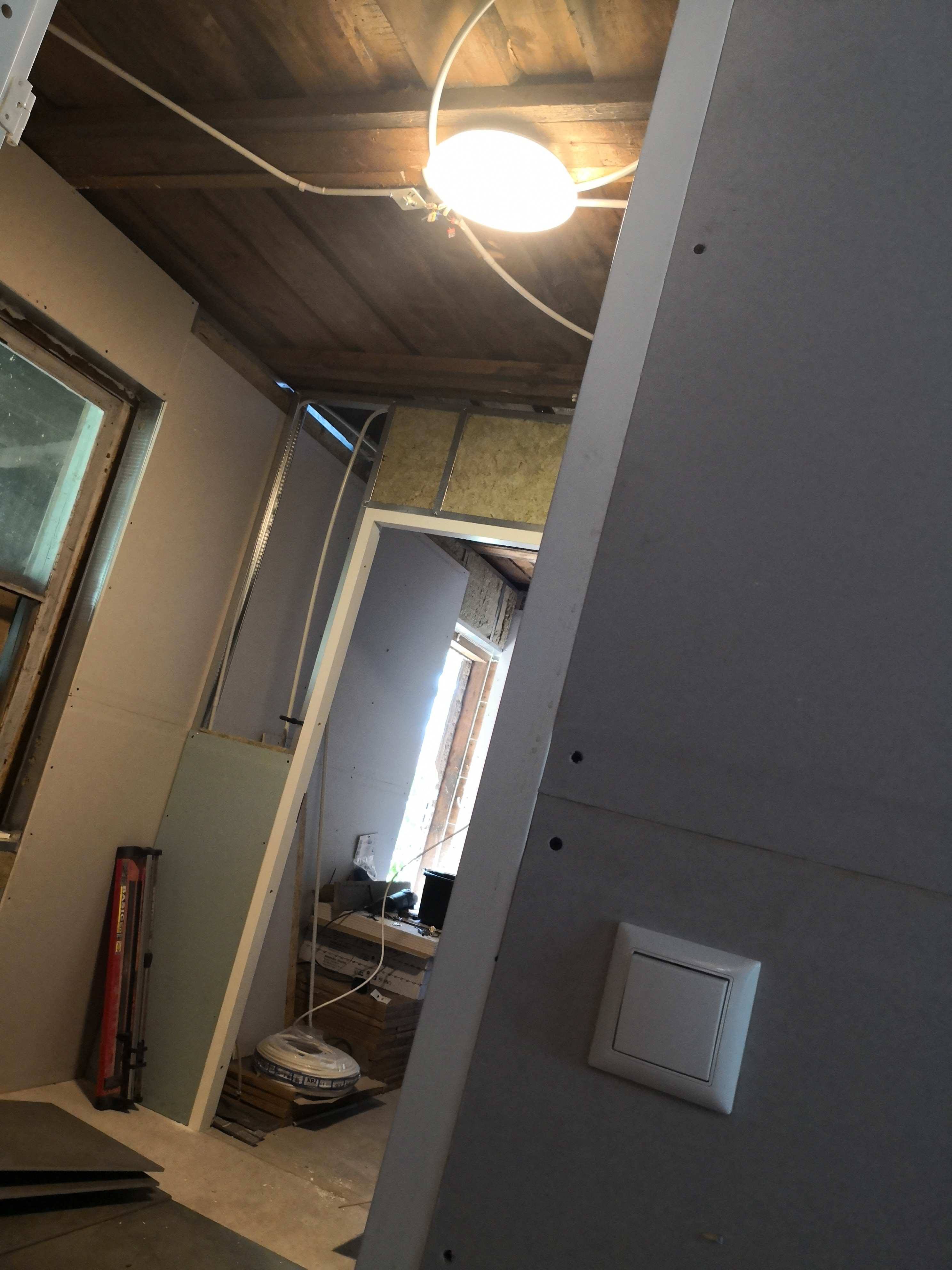 For a morning after a party I was earlier up as I would have expected. Today I wanted to make up for the less productive Saturday. I started with connecting the light switches, power sockets and lamps, so when Uve will start building the central heating system he can switch on the lights he would need and has a power outlet if he needs it. This was also a good moment to put in the last pieces of plaster plate that I had not done yet.
