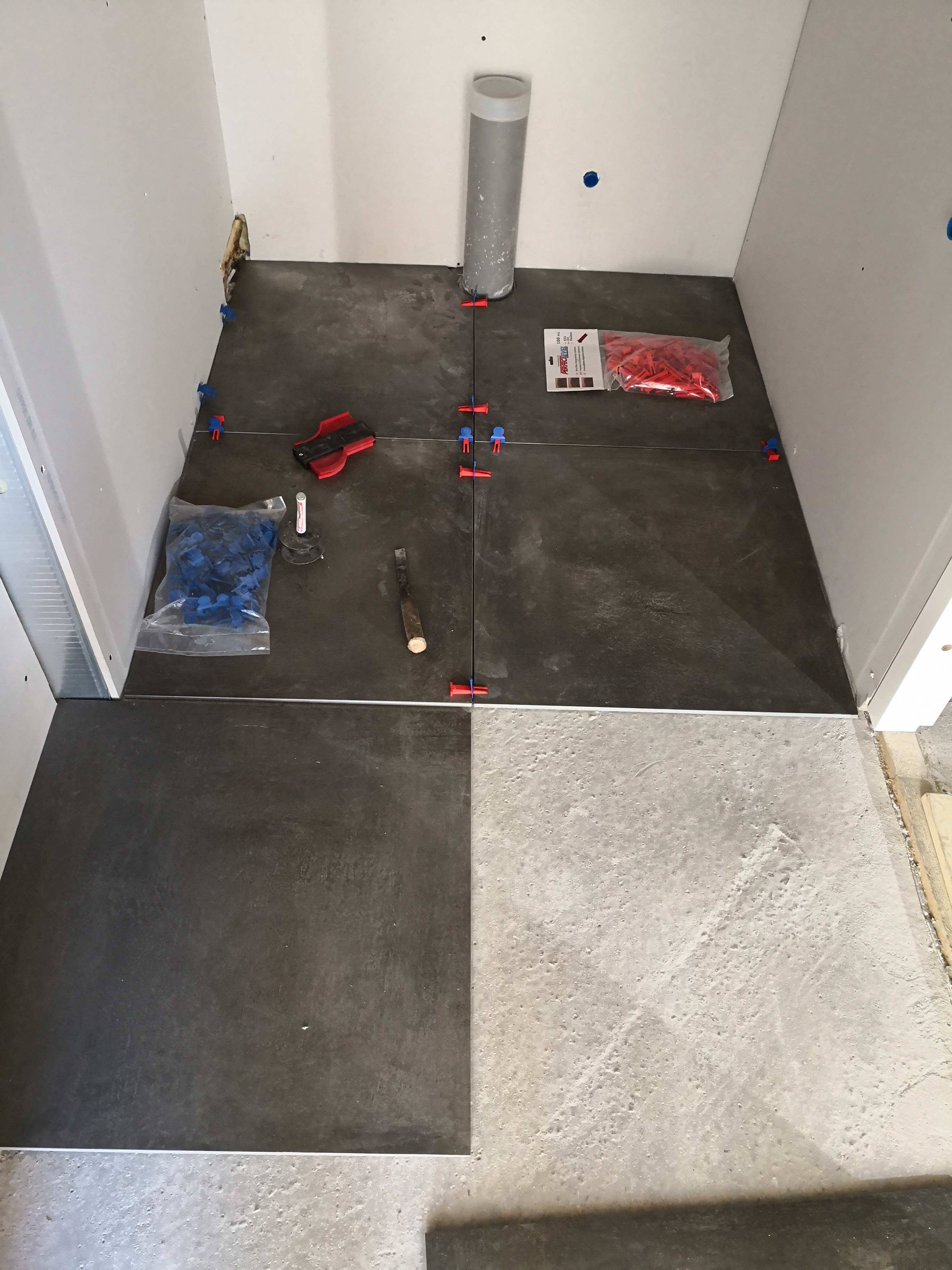 Back home I first connected the earthing wire to the earthing pin as it will be covered and then we started tiling. The tiling went pretty good, although we used much more glue then what the package suggested. Oh well, at least it came out very smooth with the special adjusters I got.