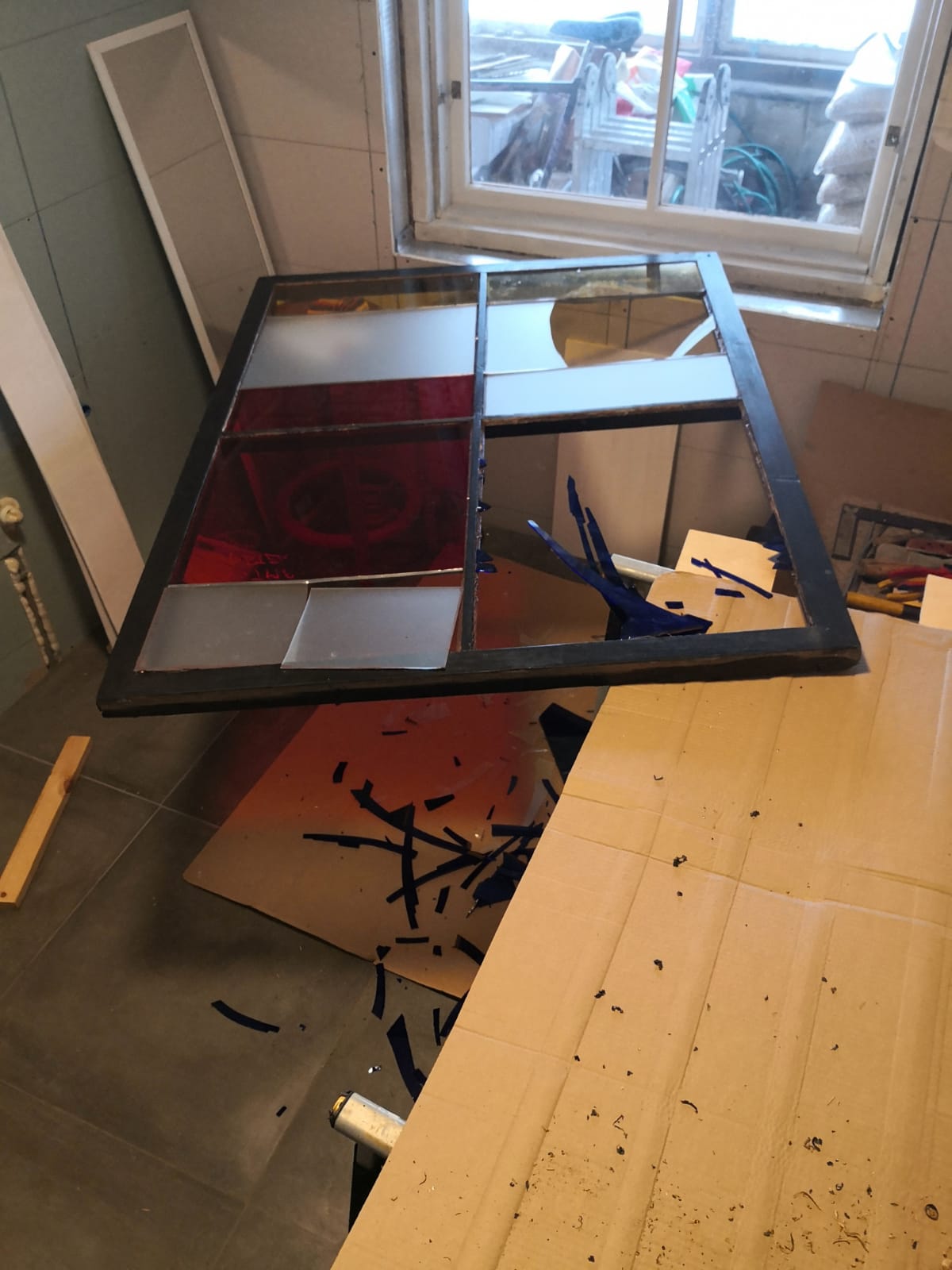 Time flies. After making the plans for the bathroom window, it took some time for Mo and me to get to the glass shop and double check on the colours of the stained glass and which frosted glass to pick. But then we could instantly order the glass and the lead strips that had to connect the pieces.
