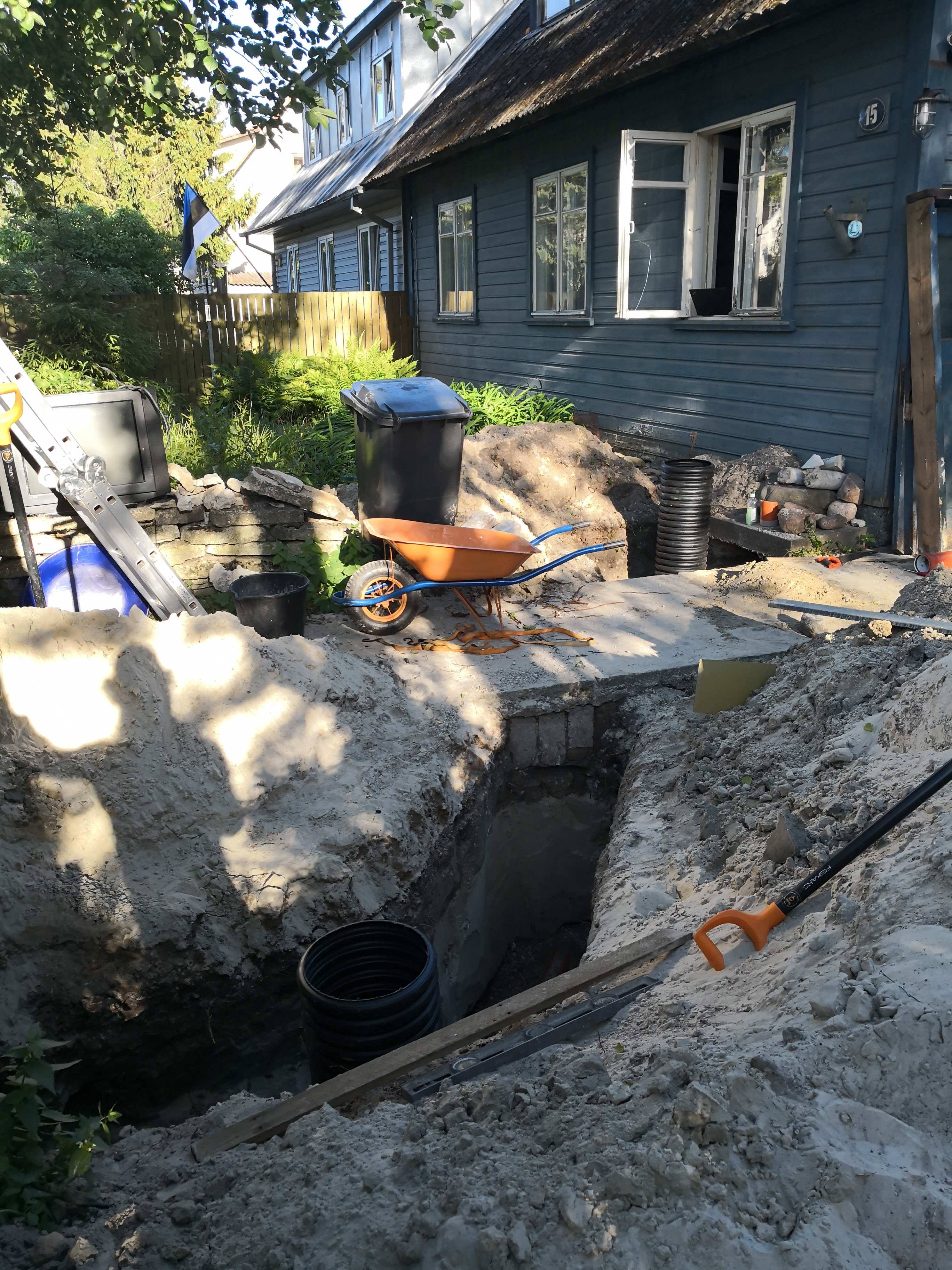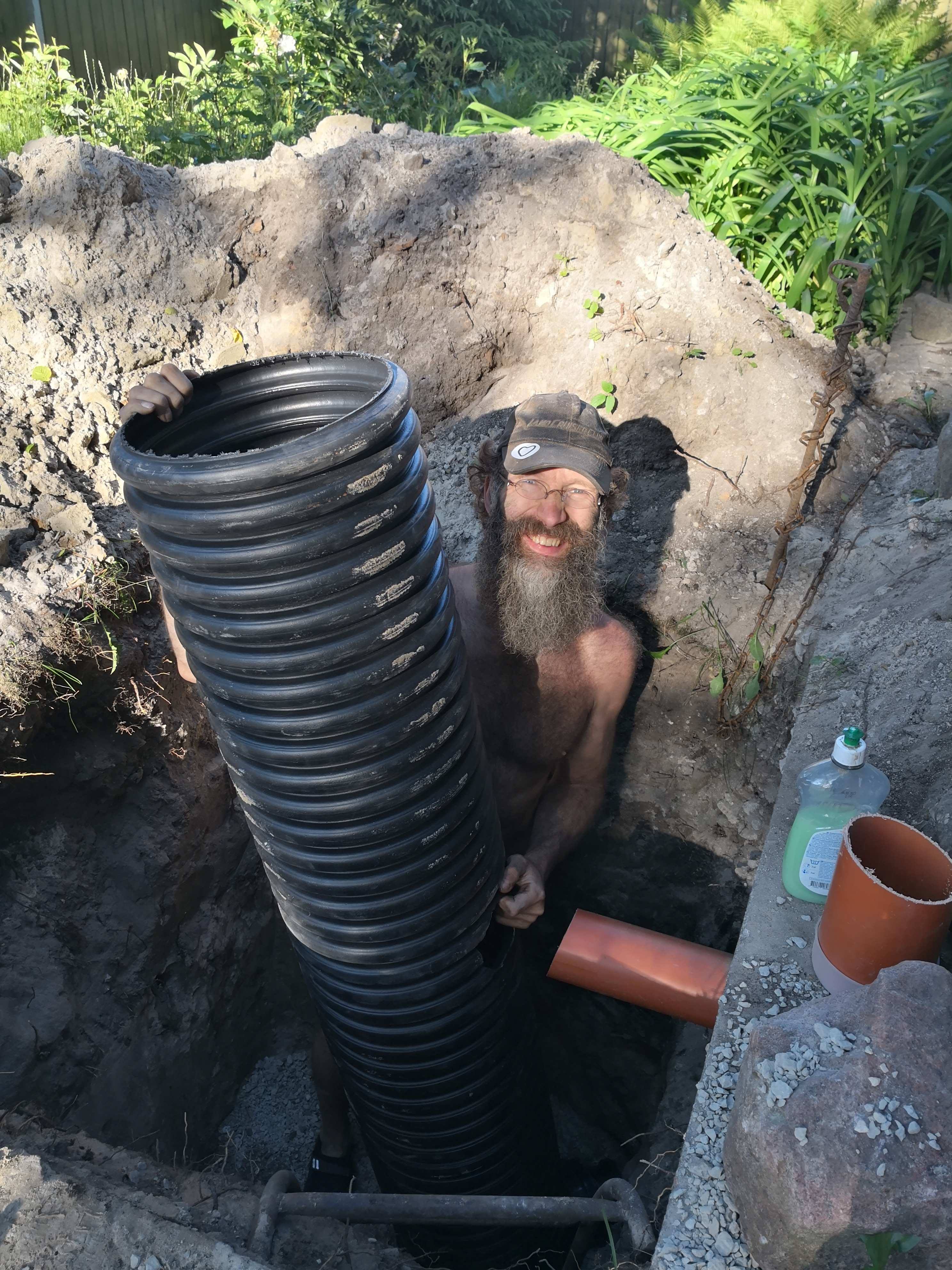 After a lot of preparing, paperwork and waiting today is the day. I will finally connect the sewer system. I started by measuring why I missed the connection under the pavement and as expected I was a few degrees off in both directions. After I adjusted the angle I pretty soon had light on the other end of the tunnel.