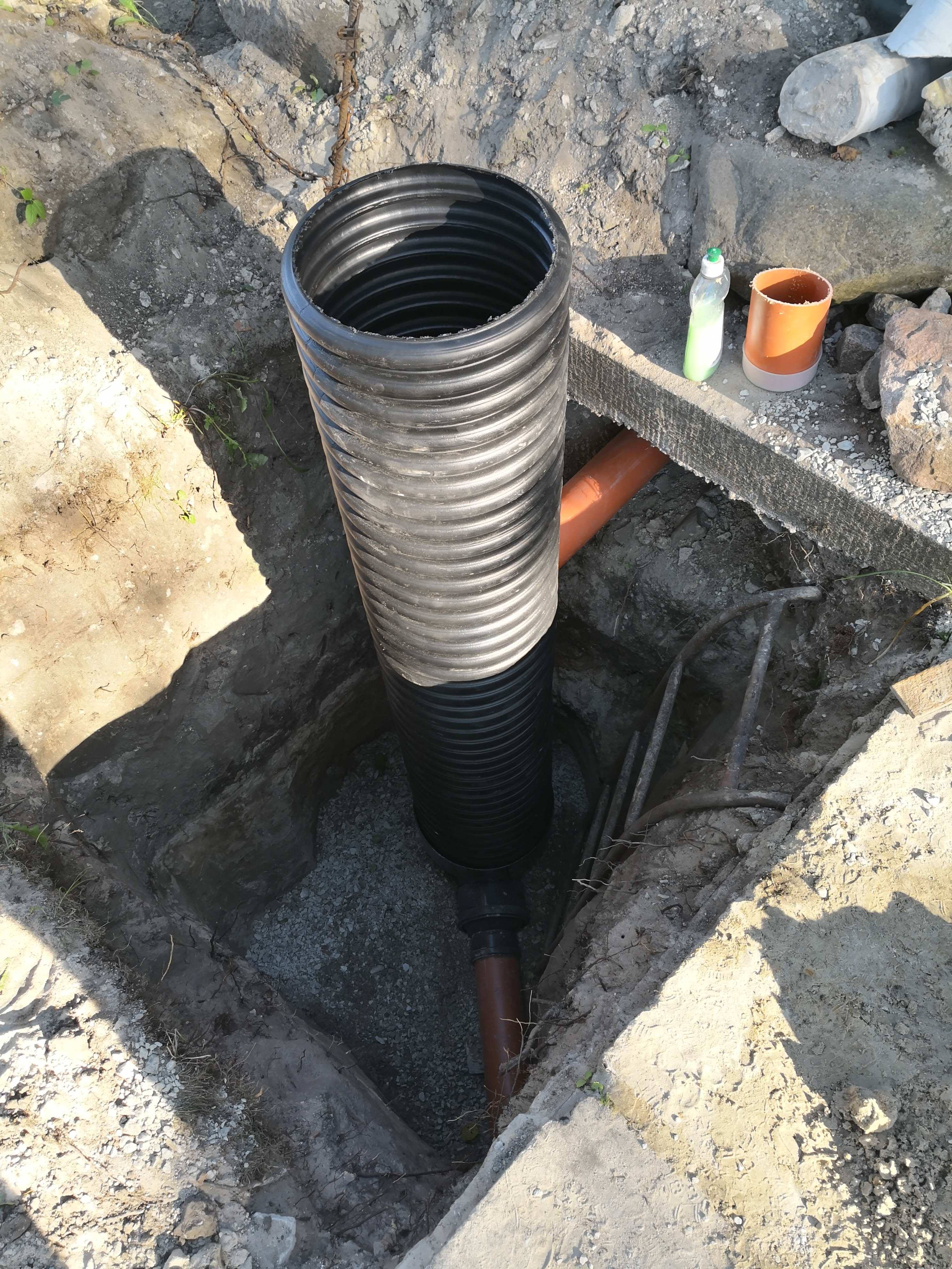 After placing the bottoms of the inspection puts I found out I drilled the hole to deep, so I adjusted that. All in all a lot of work to make sure the pipes had the right decline. I put in the foundation stones and made the grevel bed and then I was ready to put the vertical pipes.