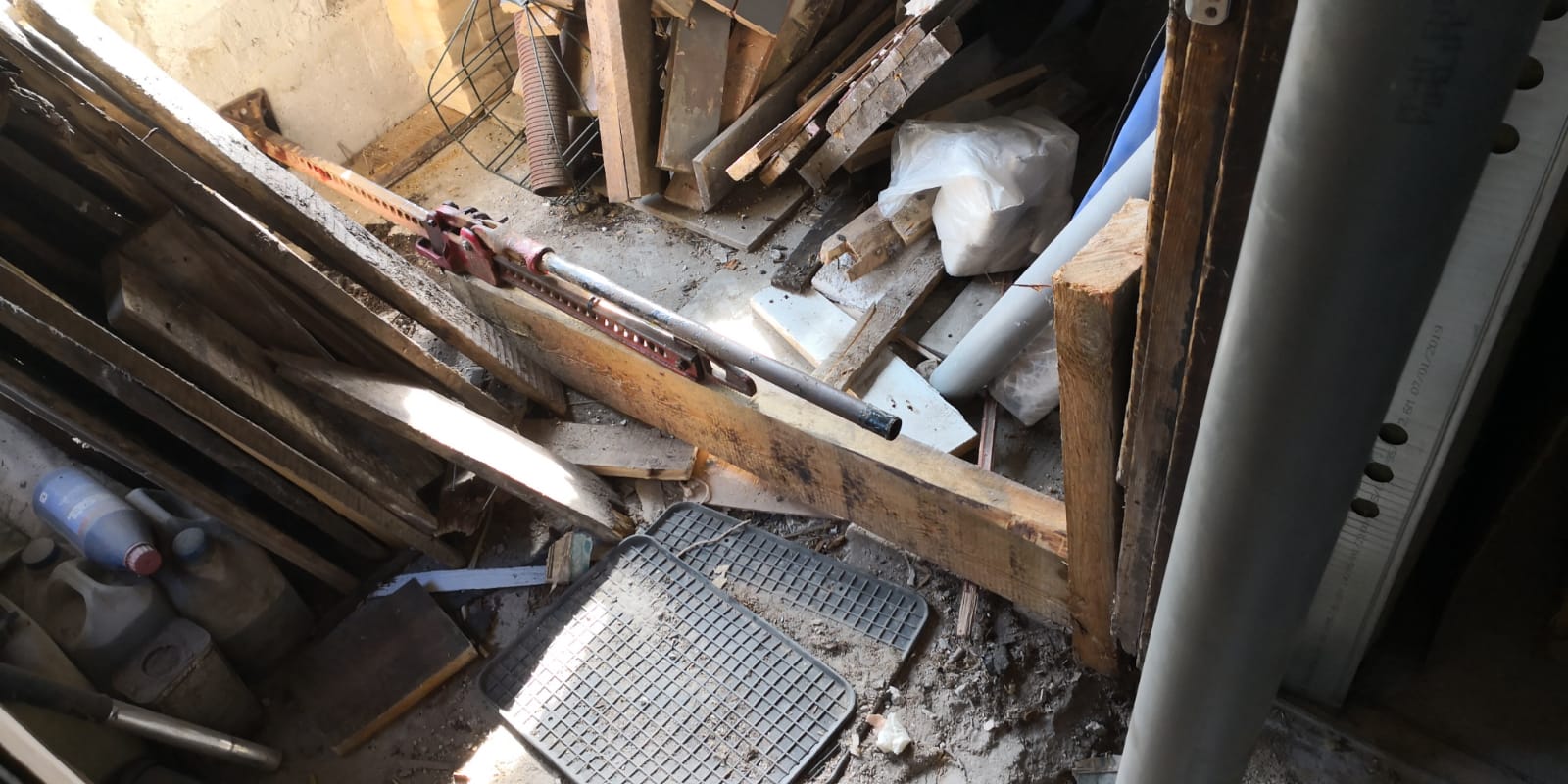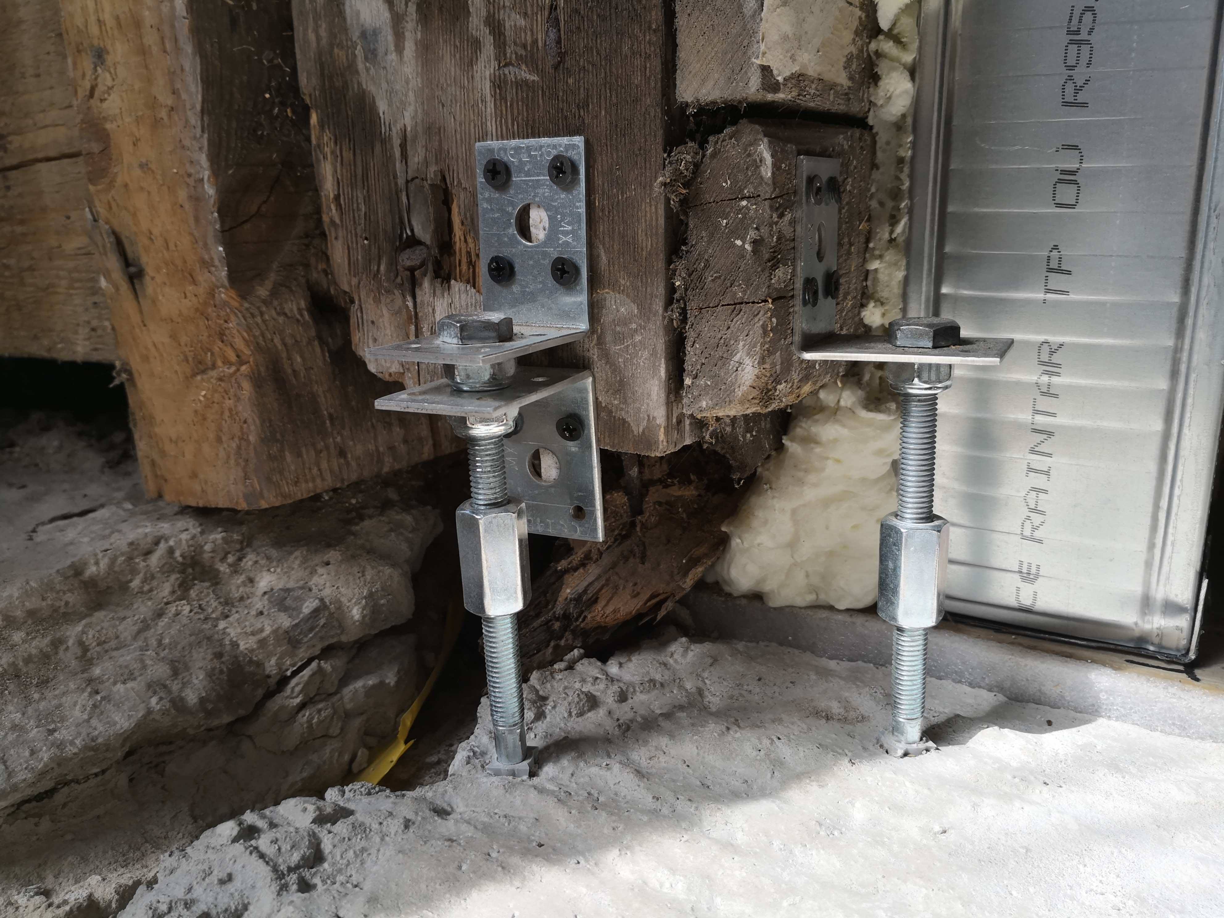 When I pushed it, I noticed some movement, so time for some heavy equipment. I took the high lift jack from the car and a wooden beam and put the doorpost and connected beam back in its place. This was very satisfying, so I treated myself to a beer while I started to make a plan how to connect this back to the floor, so it would not move back and could withstand downward force. I think I have a plan that will work…
