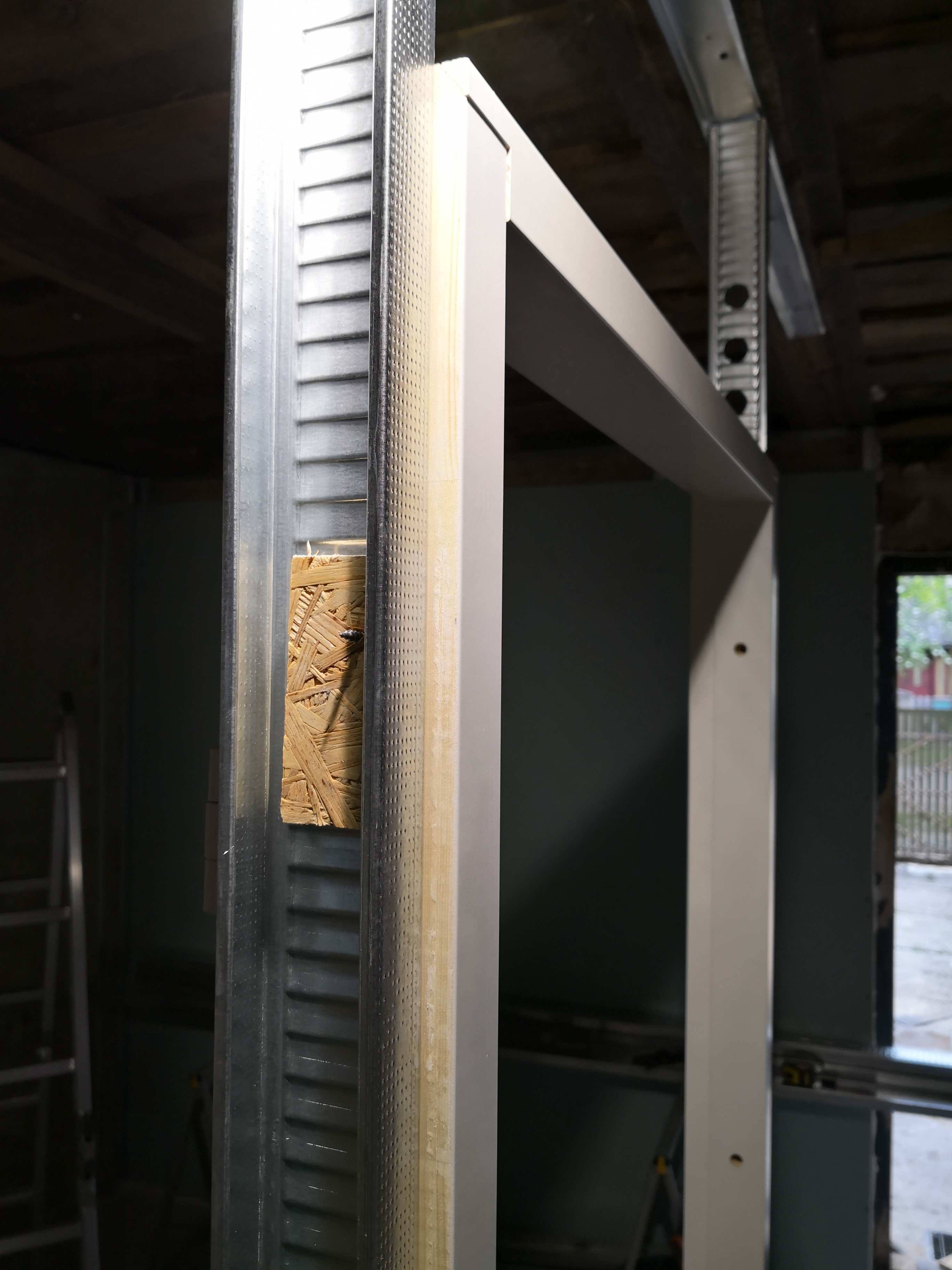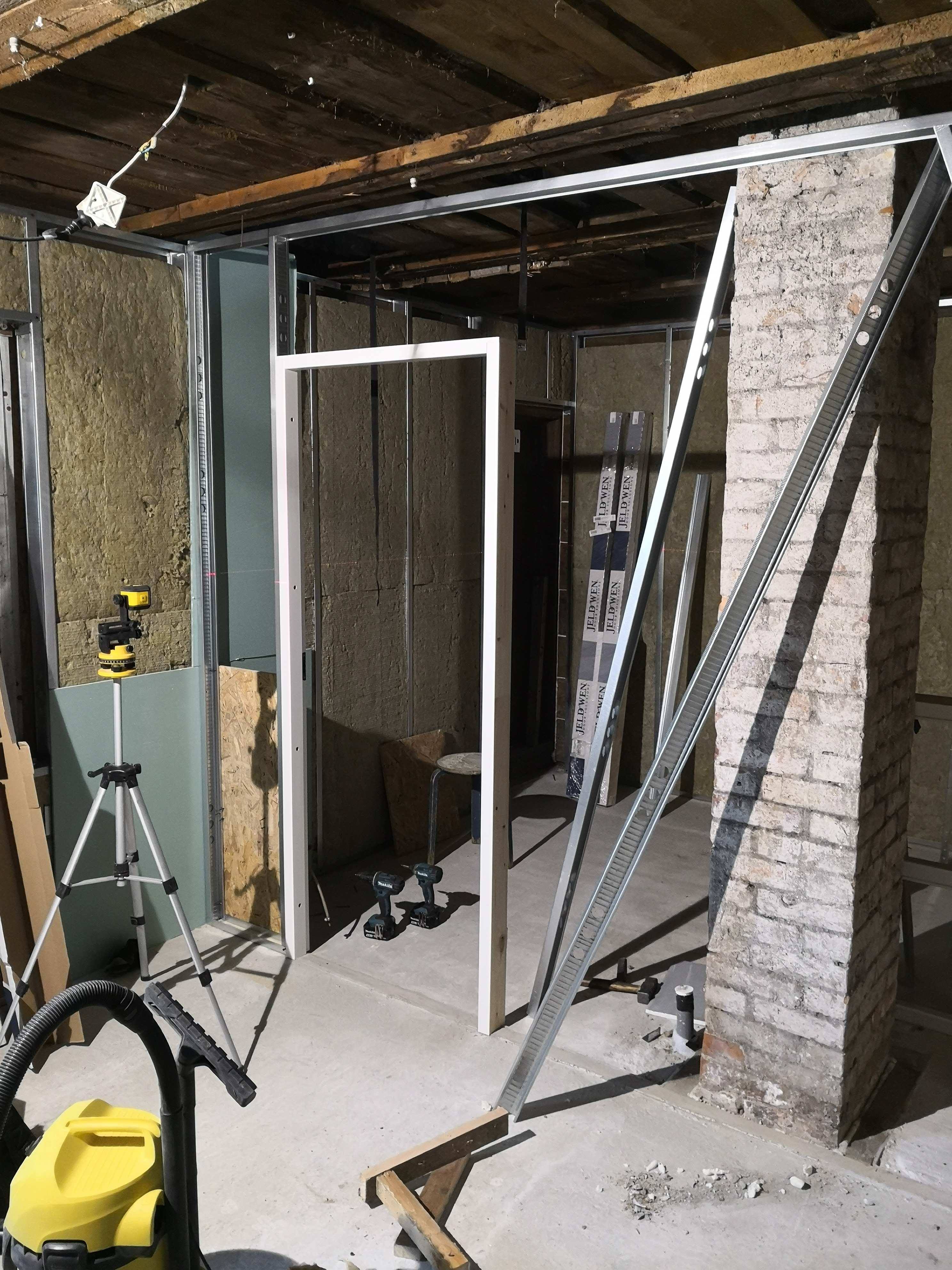 After the repair was done, I could start on the dividing wall. PuuMarket made it very easy to exchange the leftover metal stud for the narrower dividing wall studs. Bauhof had a great deal on some full wooden doors in the same style as the existing doors in the house.