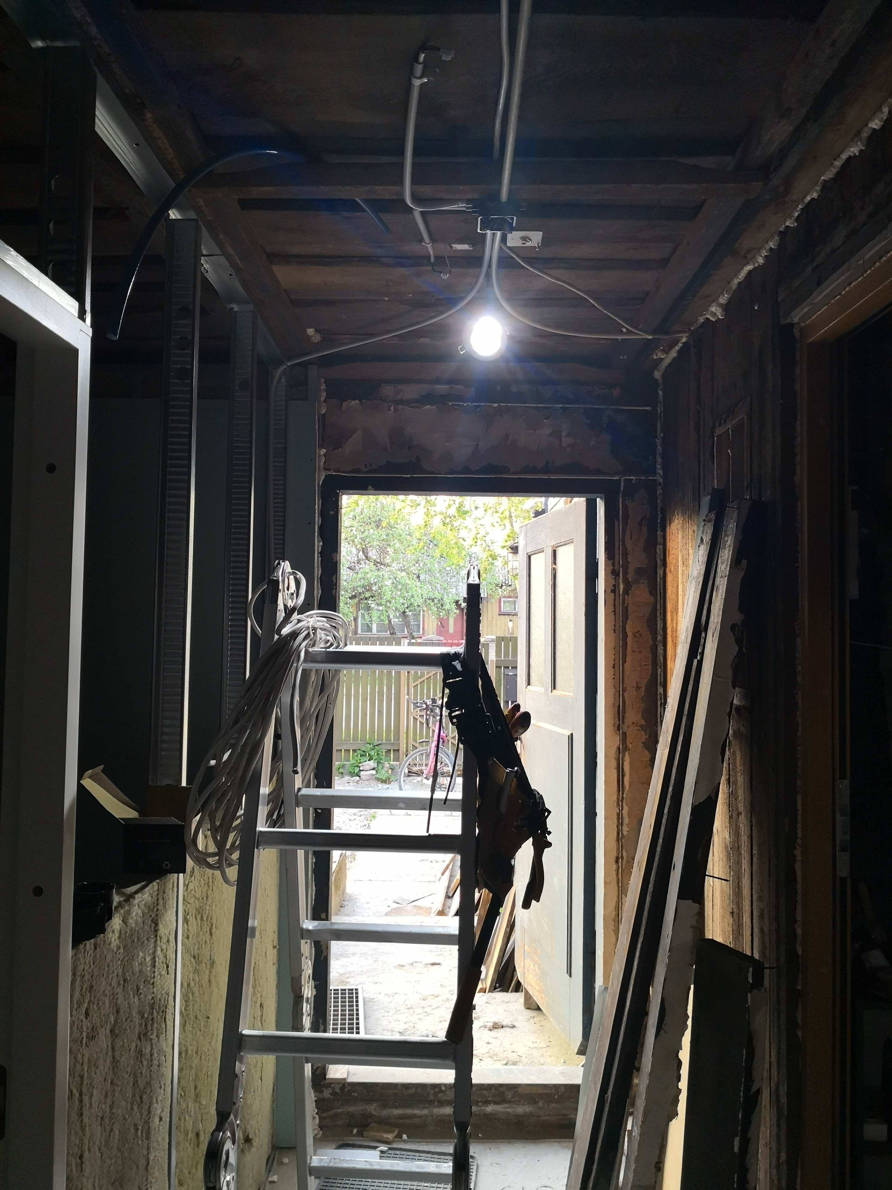 Back at home we started with the electrical system in the hallway and toilet, group 1. Martijn had to leave early today and after that my day did not go very smooth, so with a lot of struggling I finished one group, installed a temporary switch and some ceiling led lights.
