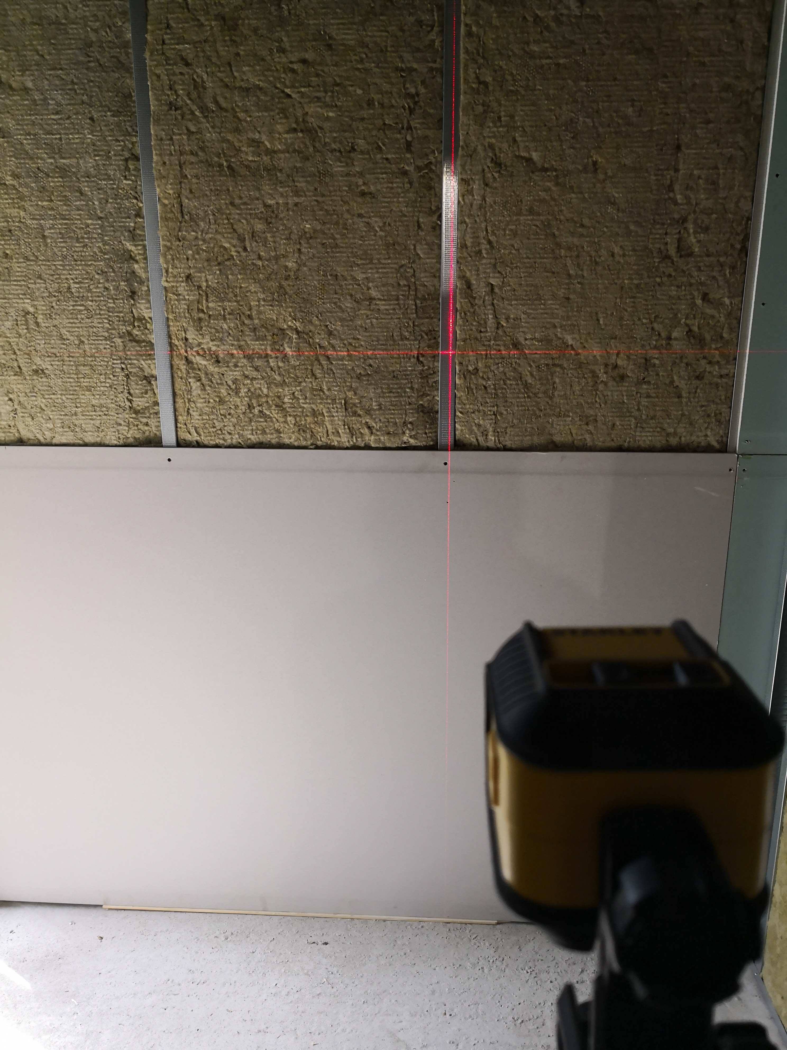 After I replaced 3 screw connections with the connection made with the wrench, I knew the rest of the walls would be build so much faster. But first lunch with Mo who came over to help. The laser was again a great tool to put all the walls and doors straight, but was also handy to put the screws in the right place through the plaster plates.