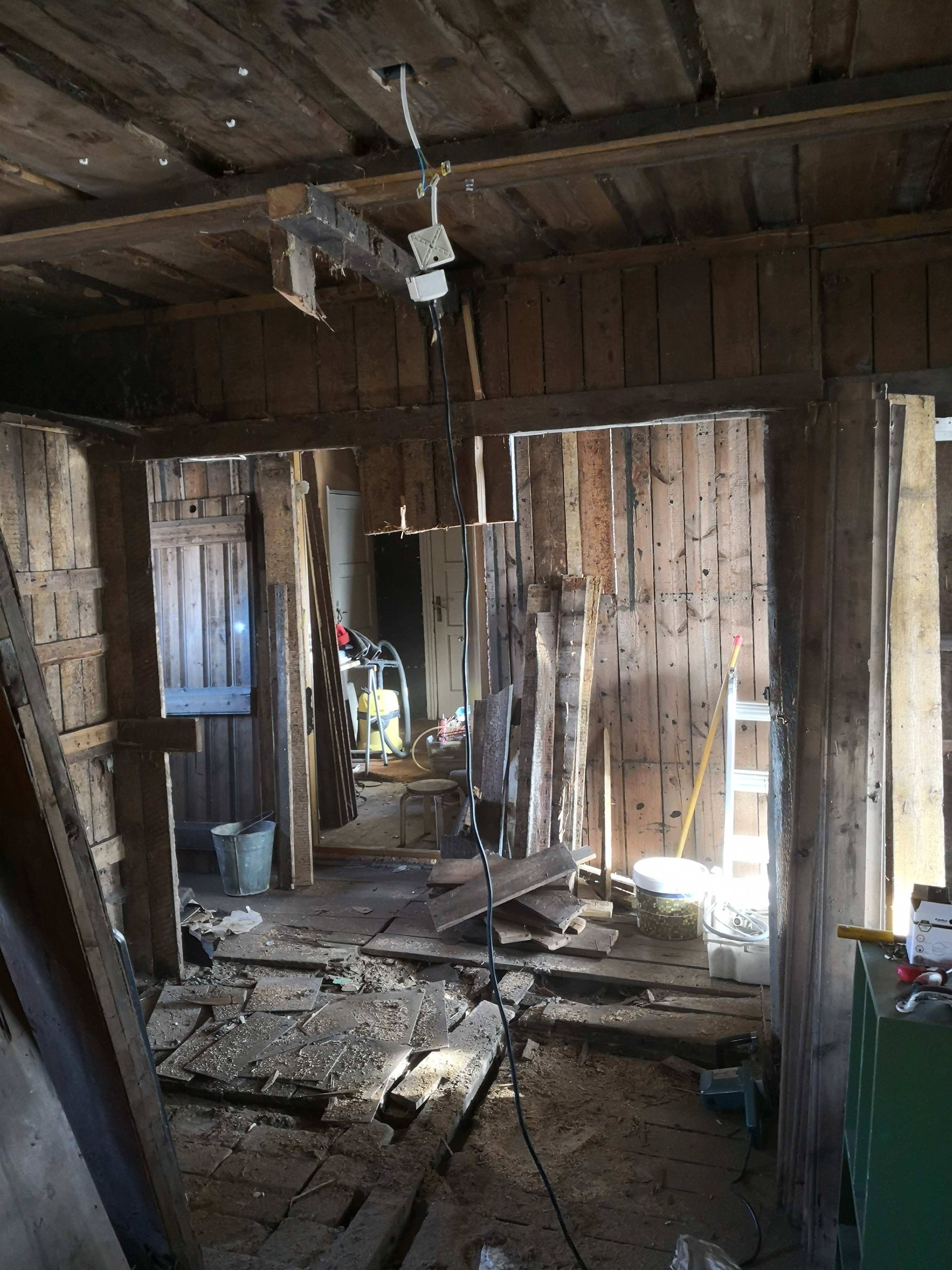 Wednesday again, and again help from Martijn. We took out more sand so the foundation was free all around the room. Then when I wanted to show how thick the insulation material is I found next to the garage, there was a nice surprise, all the plates of insulation material where still frozen together. So there was not so much need to start digging more, as we could not try the insulation material anyway, so we decided to strip down the last wall and ceiling covering down to the bare wood, so the room would be ready for the building up part. And poof, another day was gone.