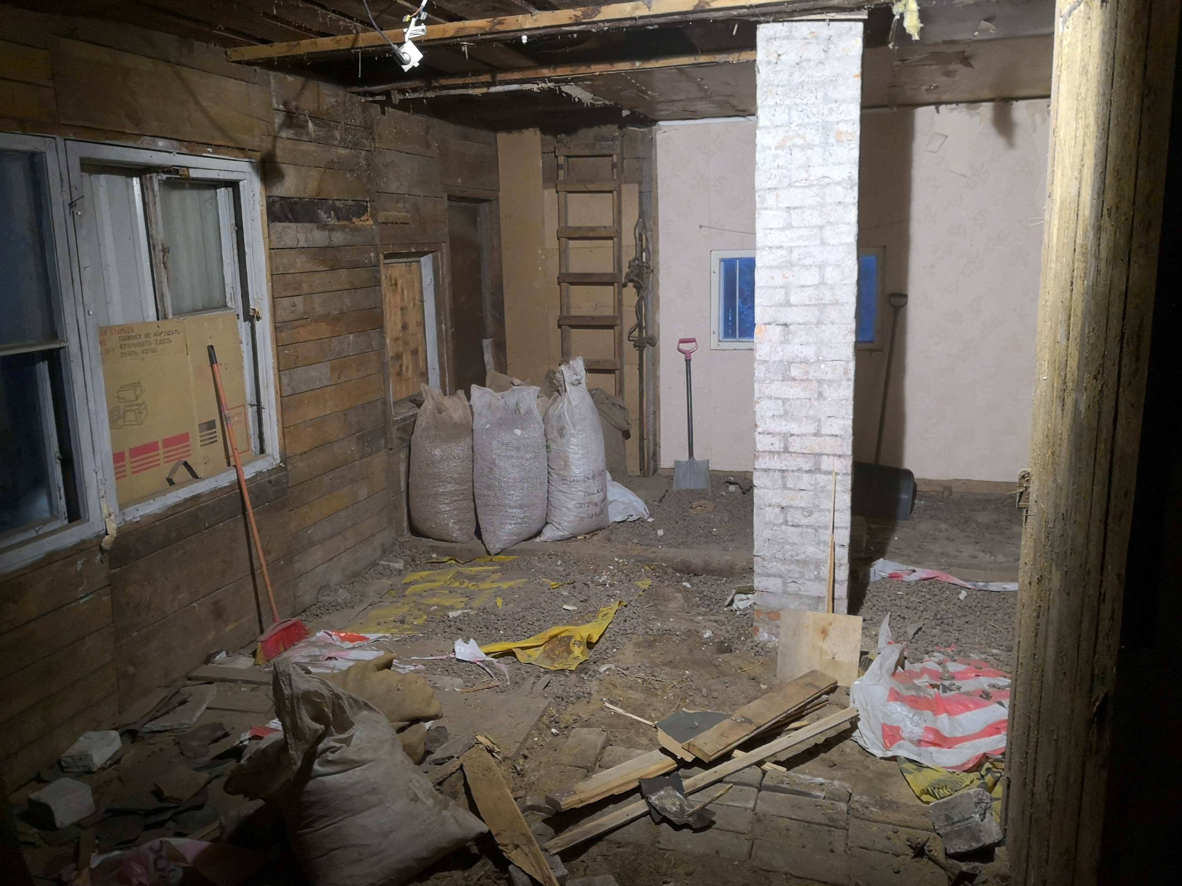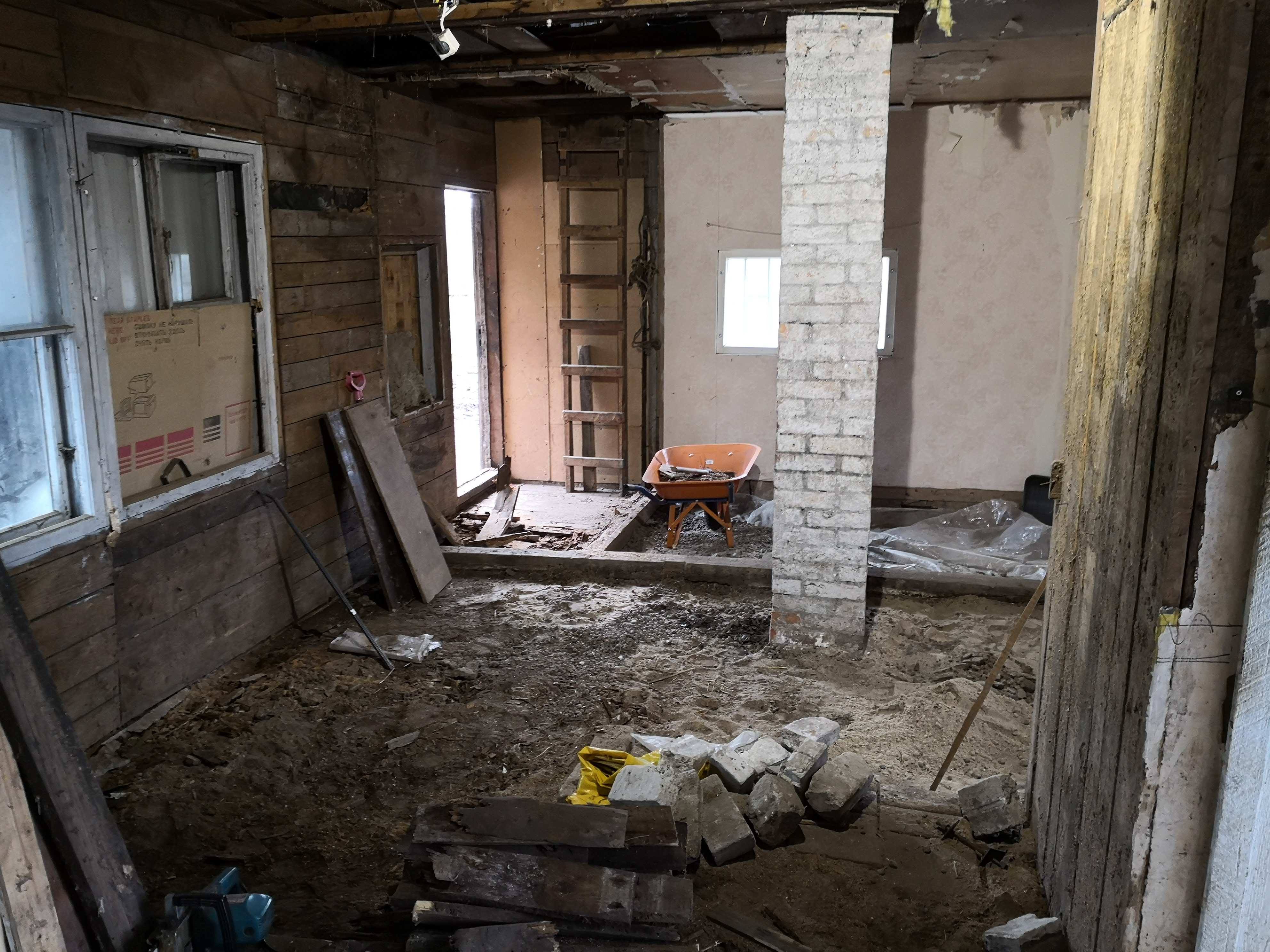 With the wall gone, it was more obvious that the condition of the floor was at least questionable. So I decided it might be better to just get rid of it and since this part of the house would have the wet rooms in it, build a concrete floor. So more demolition.