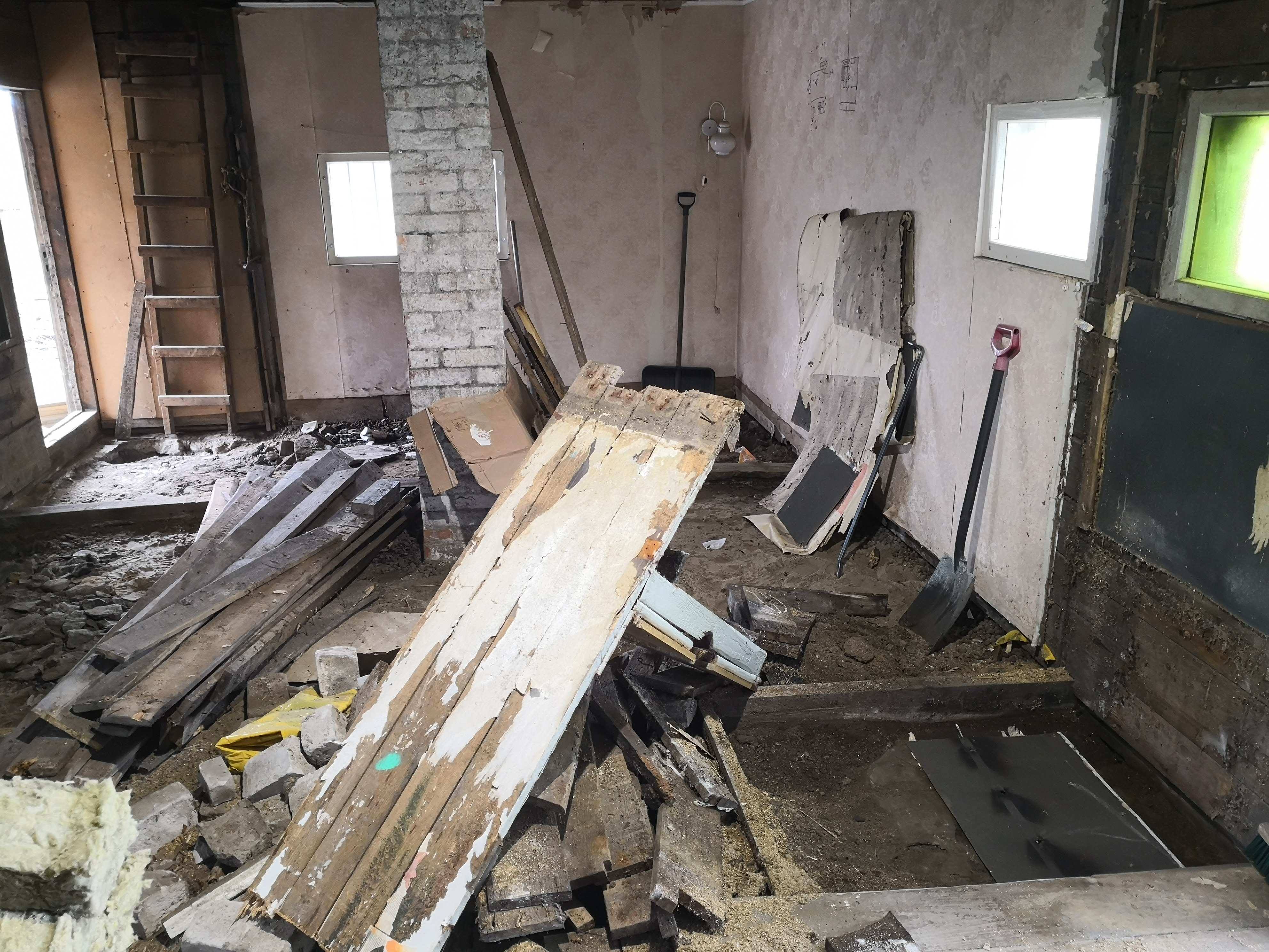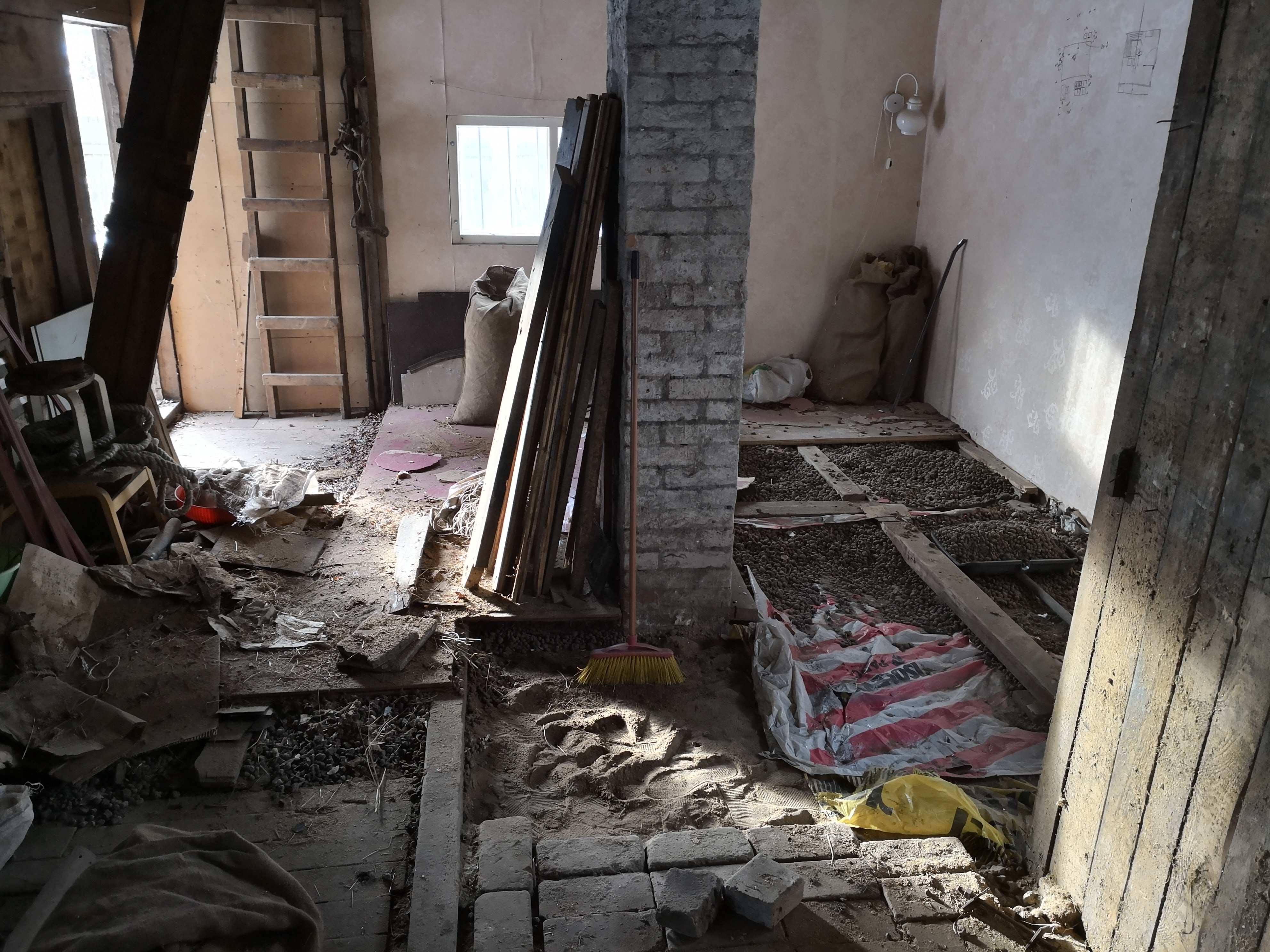 The good thing was that today I had help from Martijn who found out I work on the house on Wednesdays and he had the day of as well. We took out the stuff that had gathered in the place and started to take apart de wooden floor boards. Under it we found about 15-20 cm of hydro granules. Under the train roof I had found more of these, so we decided to bag them and take them out. On the attic we had earlier found a jute bag full of jute bags, so no shortage of big strong bags.