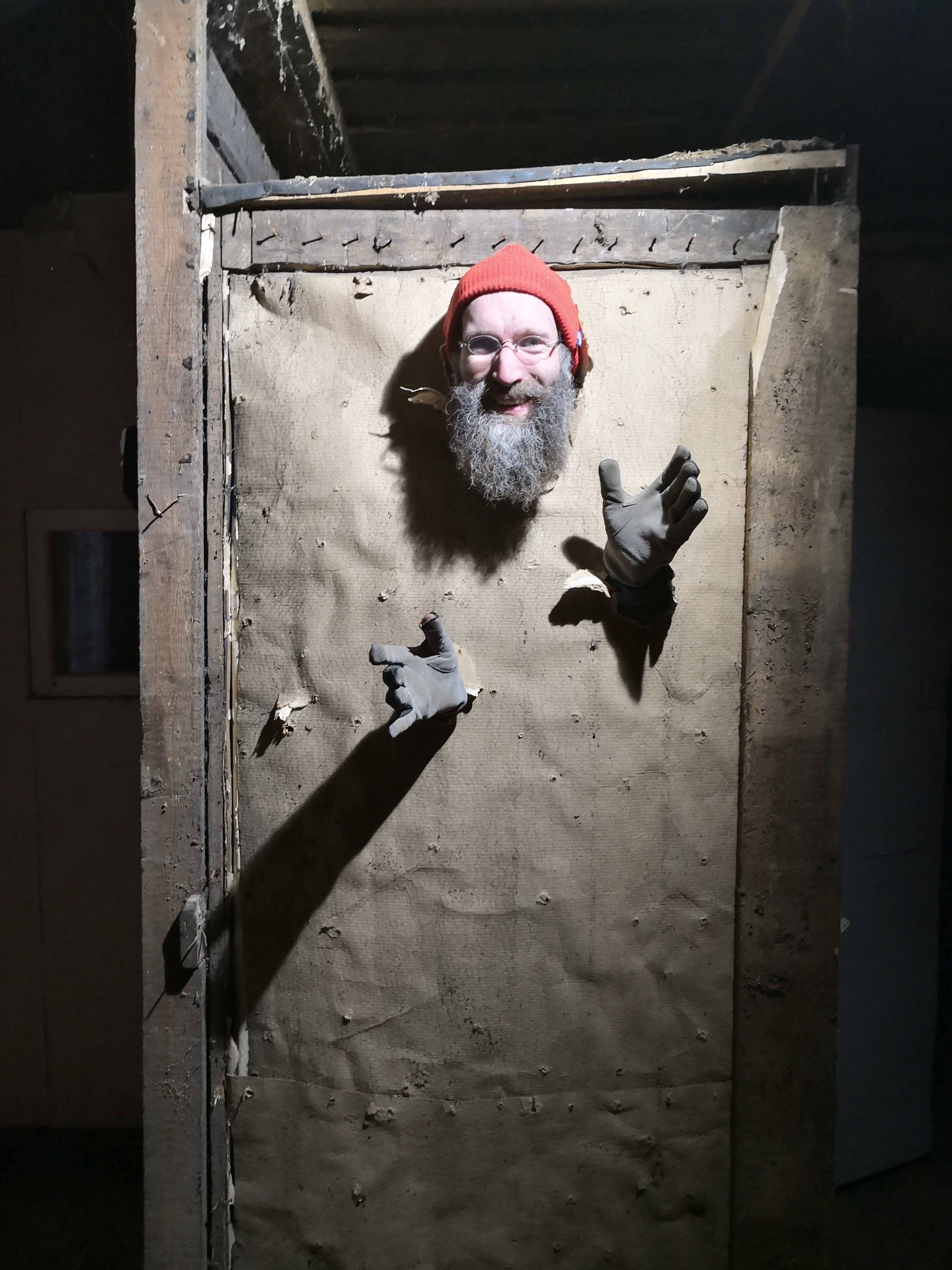 In the afternoon Mo stopped by with some lunch. We decided to also take out the toilet, as it needs to go anyway. The wall where build like a fortress, so we only took out one, behind it we the wall paper was still hanging, which reminded me of the opening scene of one of my favorite childhood show: De film van Ome Willem so I just had to do an ‘Ome Willem entrance’.