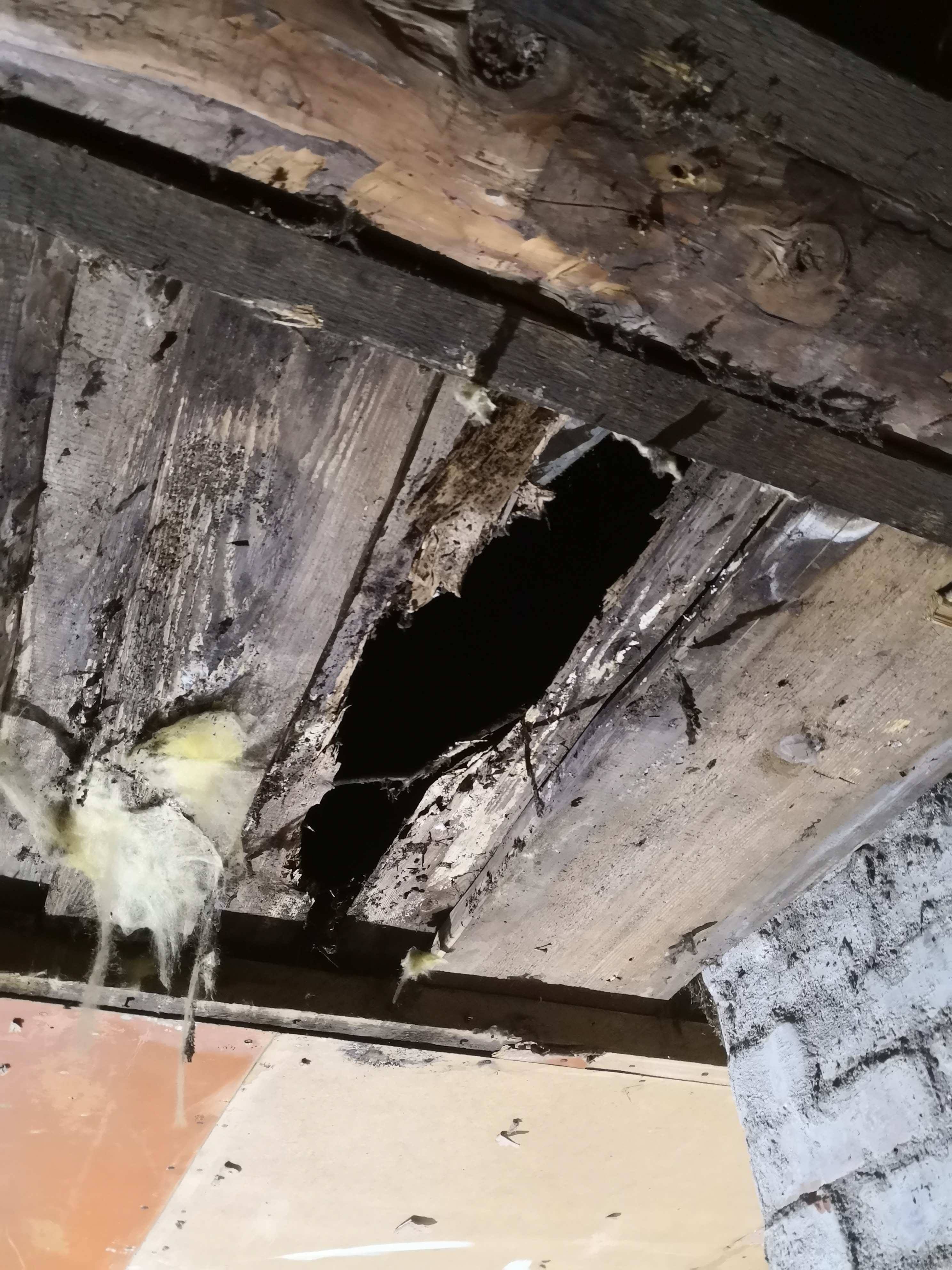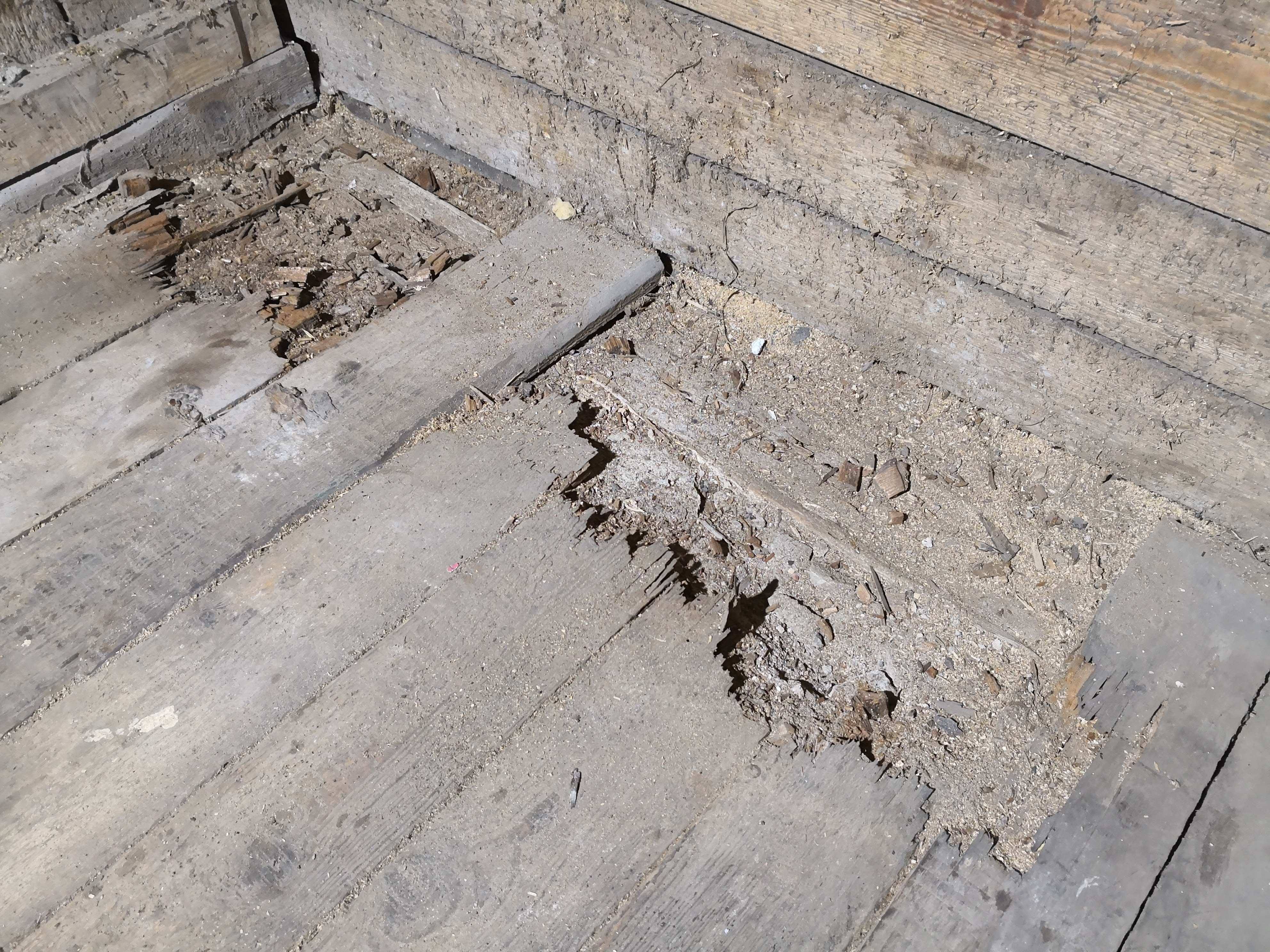 When I took of some ceiling covering and insulation I found a rotten part in the ceiling that came out very easy. (It was situated under the access hedge for the small chimney.) At the final cleanup I also found some floor boards which had seen better times. These are the first bad parts in find in the house, and they are relative easy to replace, so I am pretty happy.