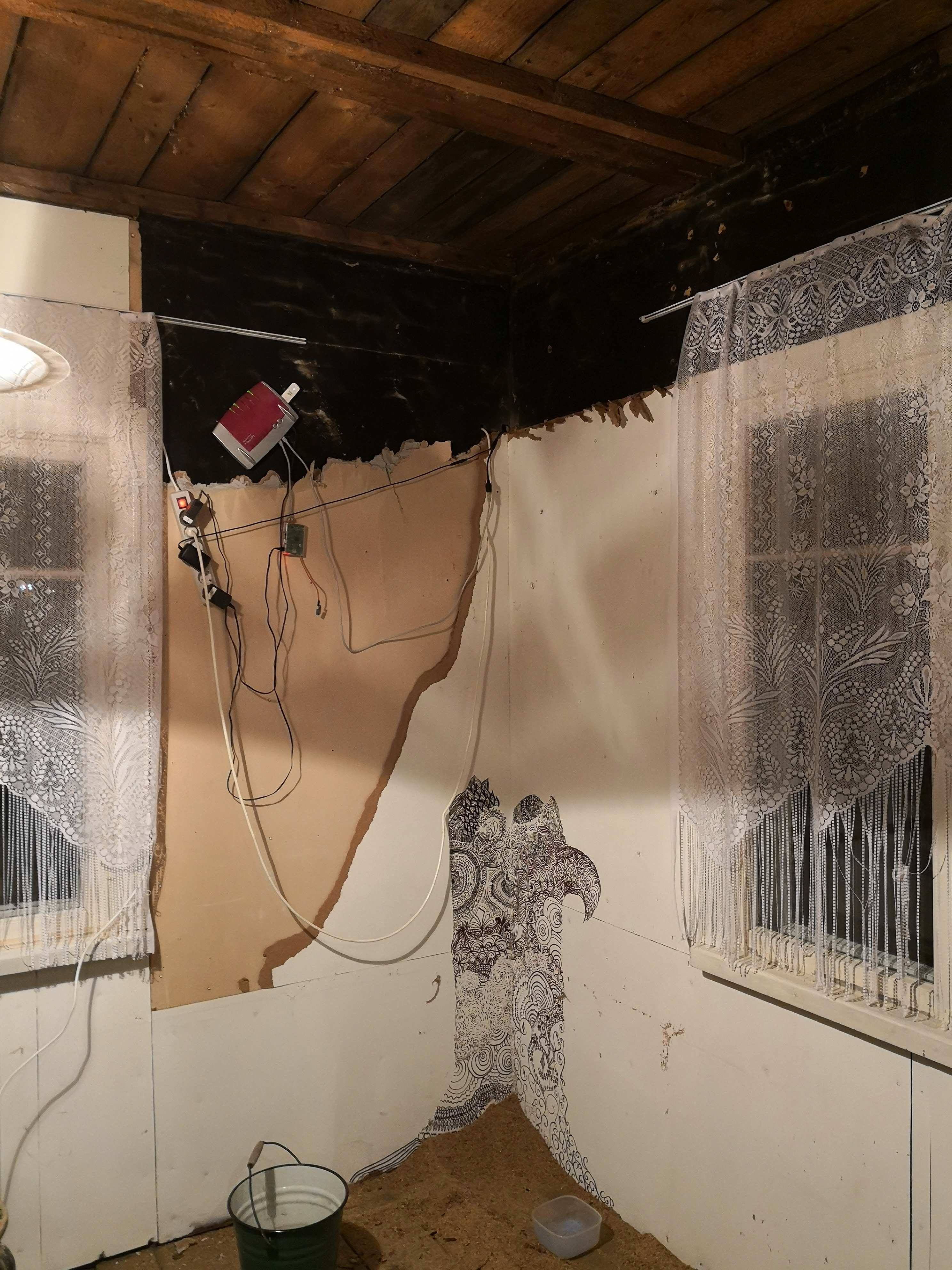 To prepare for the installation I took out the last pieces of ceiling and some of the wall covering consisting of a layer of hard and some plaster plate. before you got to the wooden wall covered by some black cardboard I had found before.