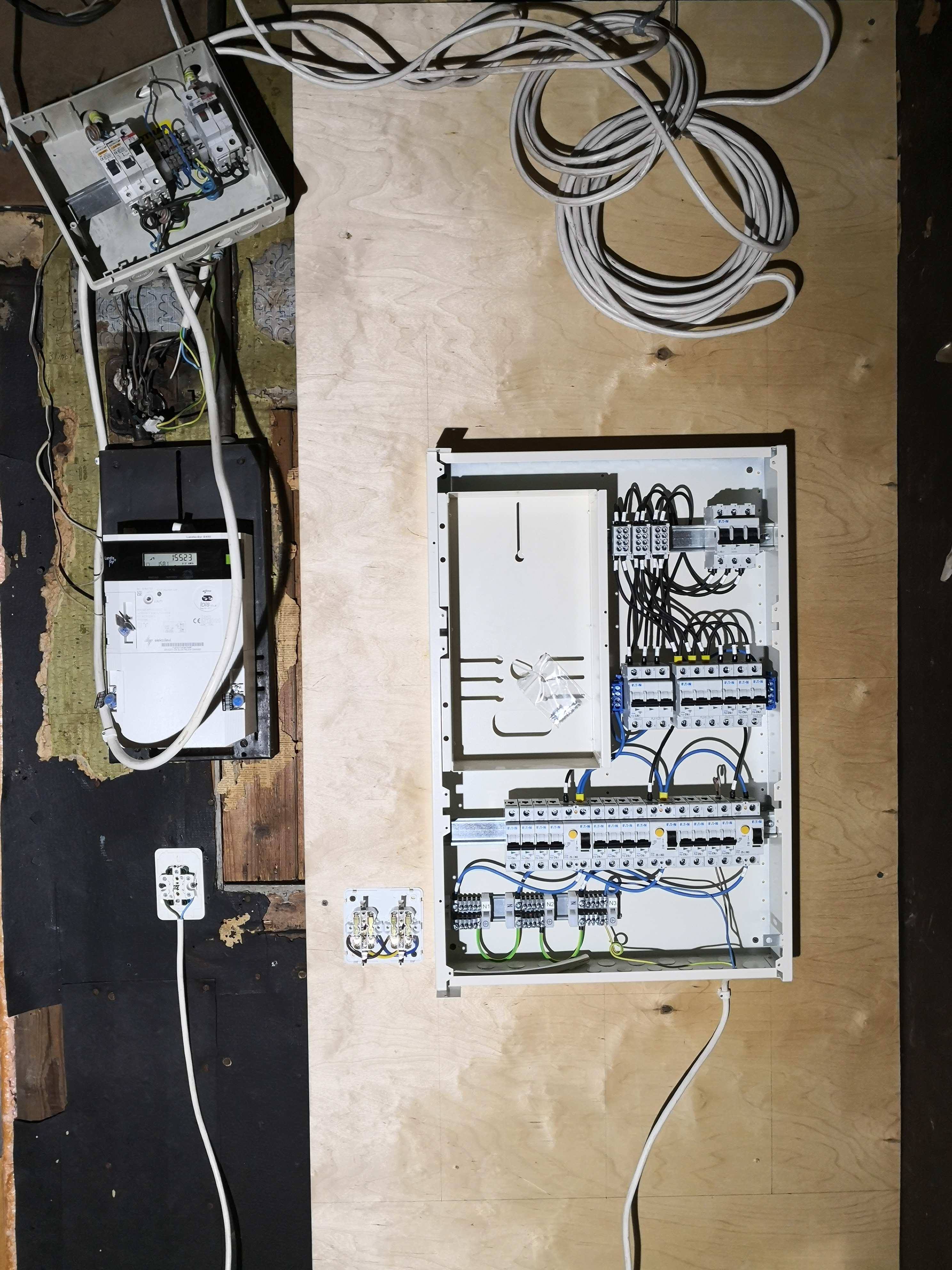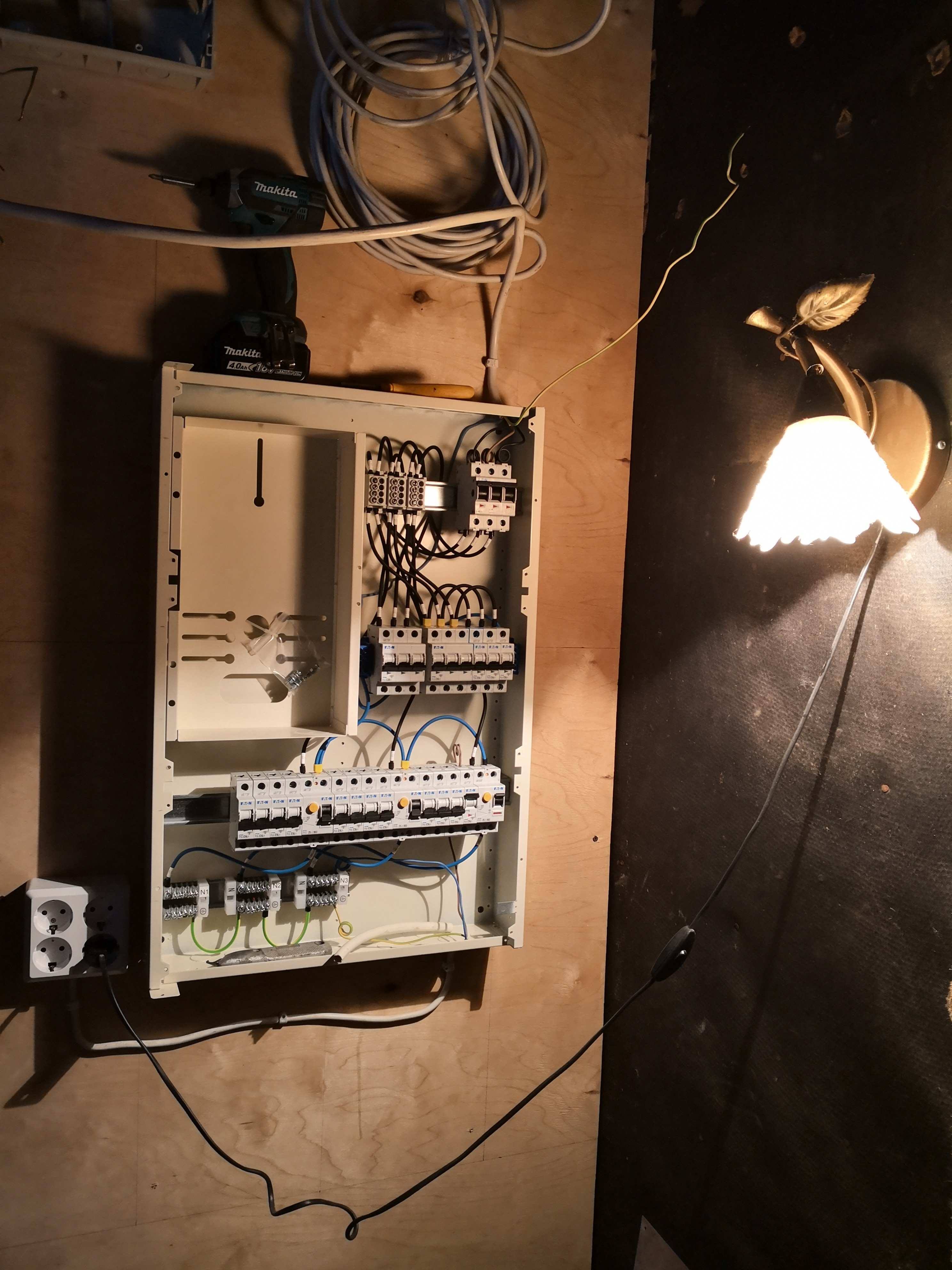 With the fuse box all wired up, it was time to place it in the house and take out the old fuse box. I made a plywood back wall to fit and put it into place. After that I once again took out the main fuses and transferred the wires to the new fuse box. After the main connection had been made the first wires I connected where going to a power plug next to the fuse box so I could hook up a light there for the rest of the connections. Then the moment of truth came. Main fuse on, residual-current circuit breaker on, circuit breaker on, light switch on. No sparks just light. A happy moment!
