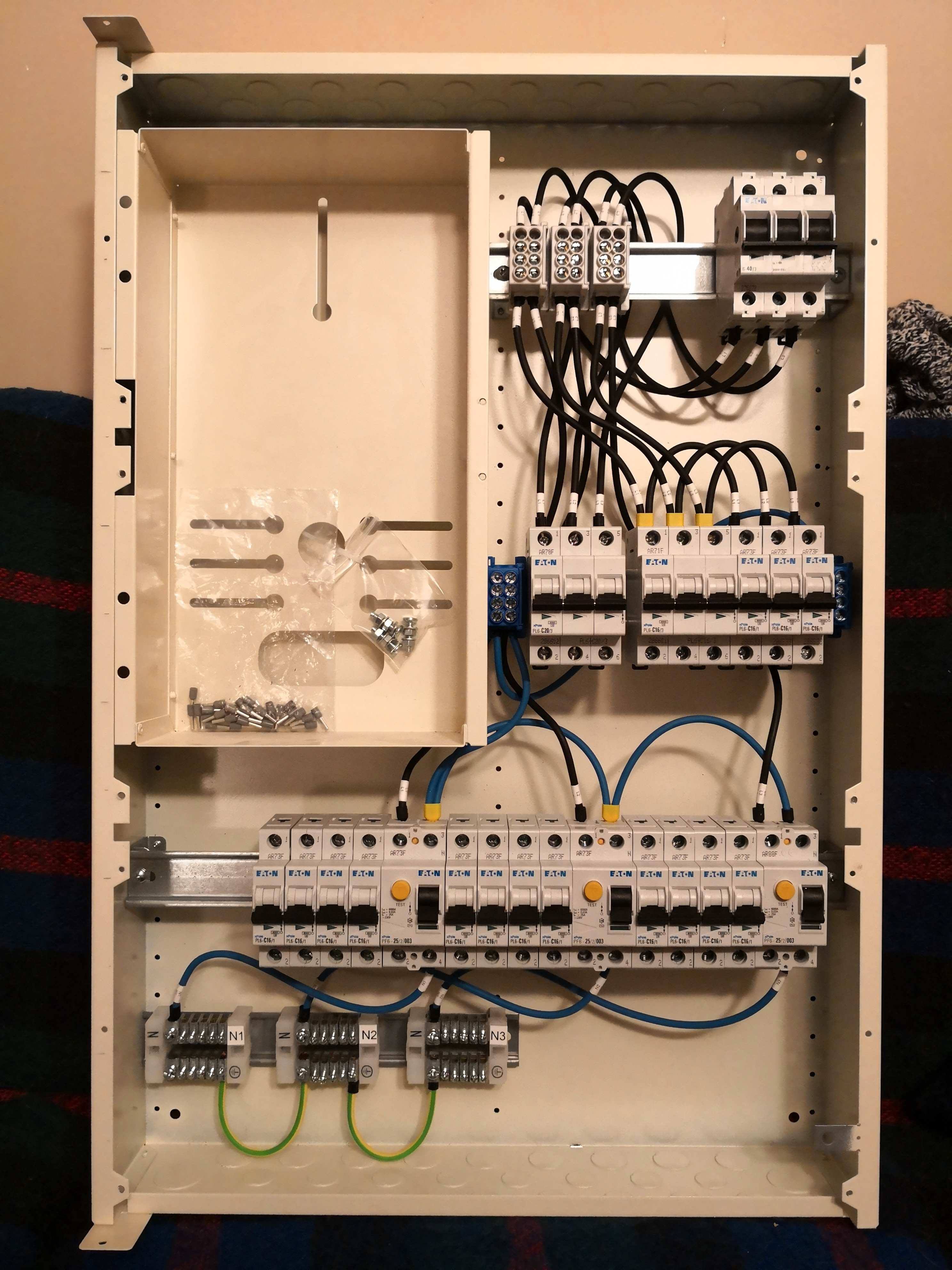 After this, I transferred the wires from the old fuse box to the new fuse box. When this was done I made detailed plans on which group would service what part of the house, trying to have two groups from two different phases next to each other in the living room and upstairs bedrooms, so in case one phase would fail the other can still provide some light.