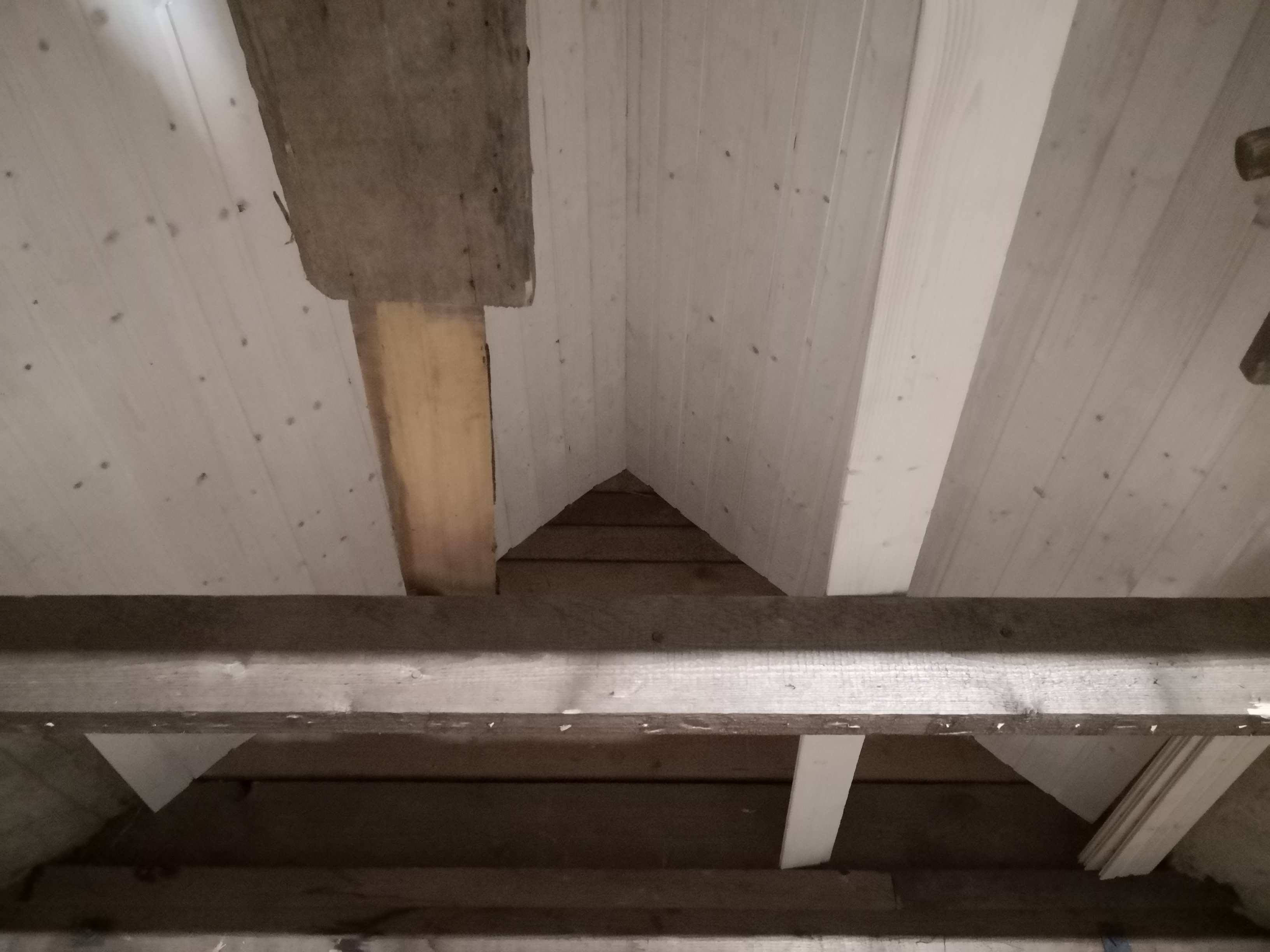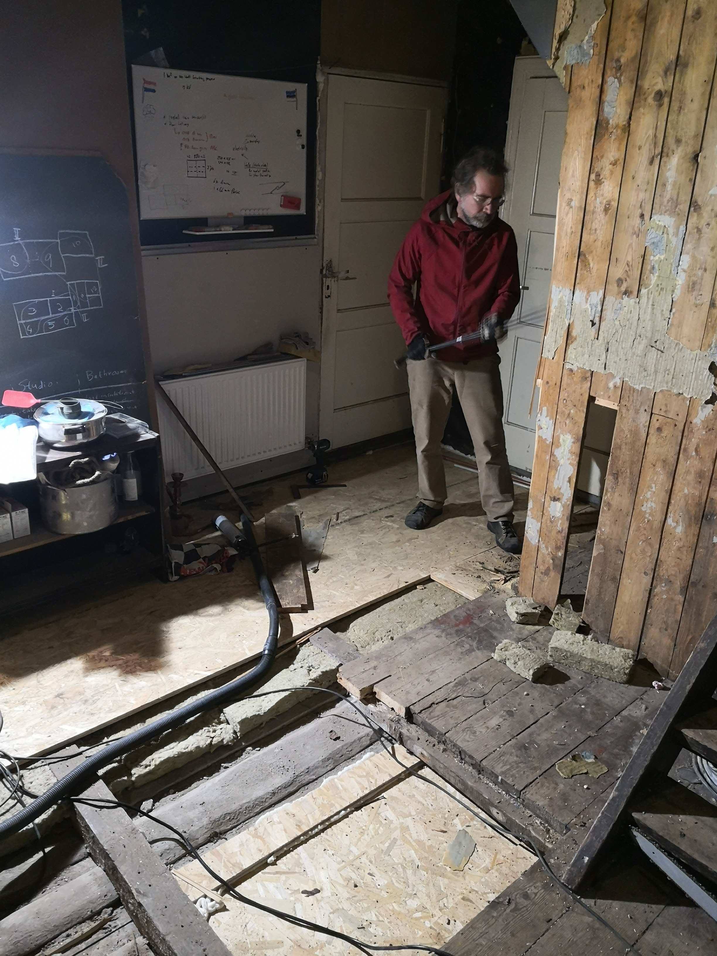 On Saturday Jeff came to help. We got the osb and insulation for the floor and started taking out the 4 cm thick beams. Pretty soon we found the first once with woodworm in it, so it was double good to take out the floor. Since we had to make an underfloor to hold the insulation and then close it, time flew by so we did not finish during the weekend, but we did get close. Already half way the work we noticed the hallway was getting more comfortable.