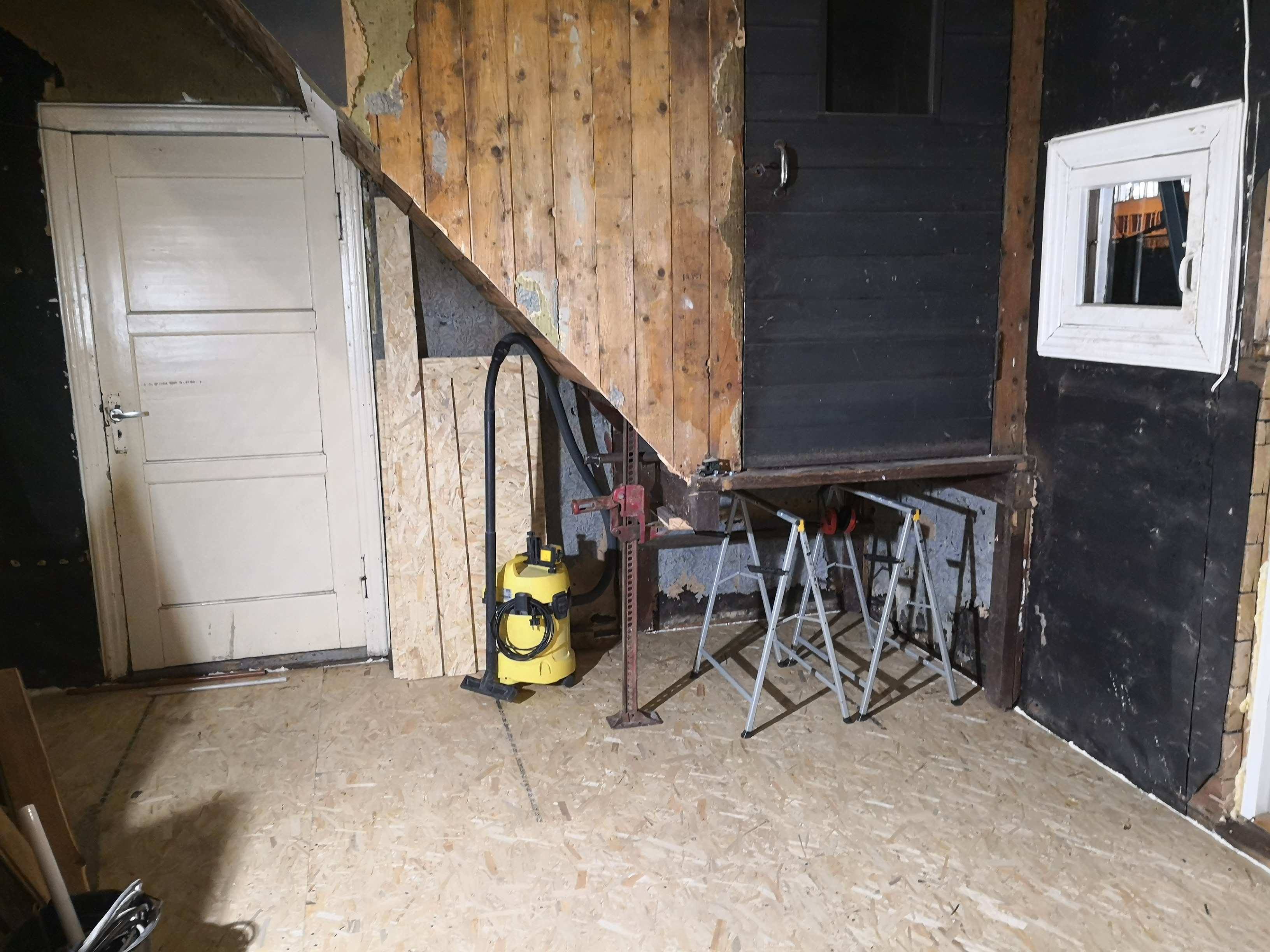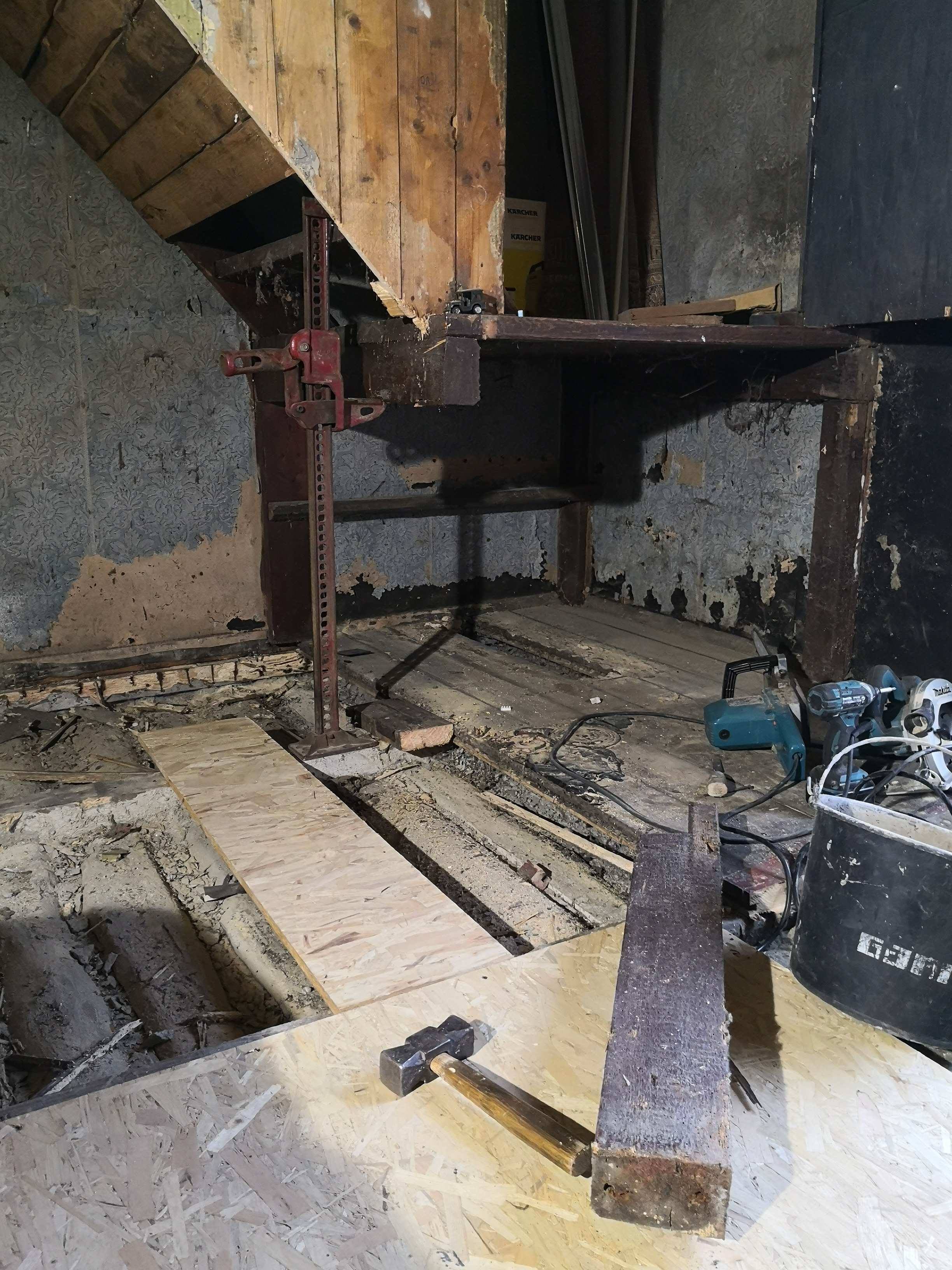 The next day I just had to replace the last part in front of the door and under the stairs. When I crawled under the stairs, I found a piece of would so filled with woodworm I could just vacuum it away, so I was very happy this floor was being replaced. But to replace the floor I needed to remove a supporting beam of the stairs. This is where the highlift jack came in handy again. At the end of the day the floor was fully replaced and we had a garden full of future burning wood.