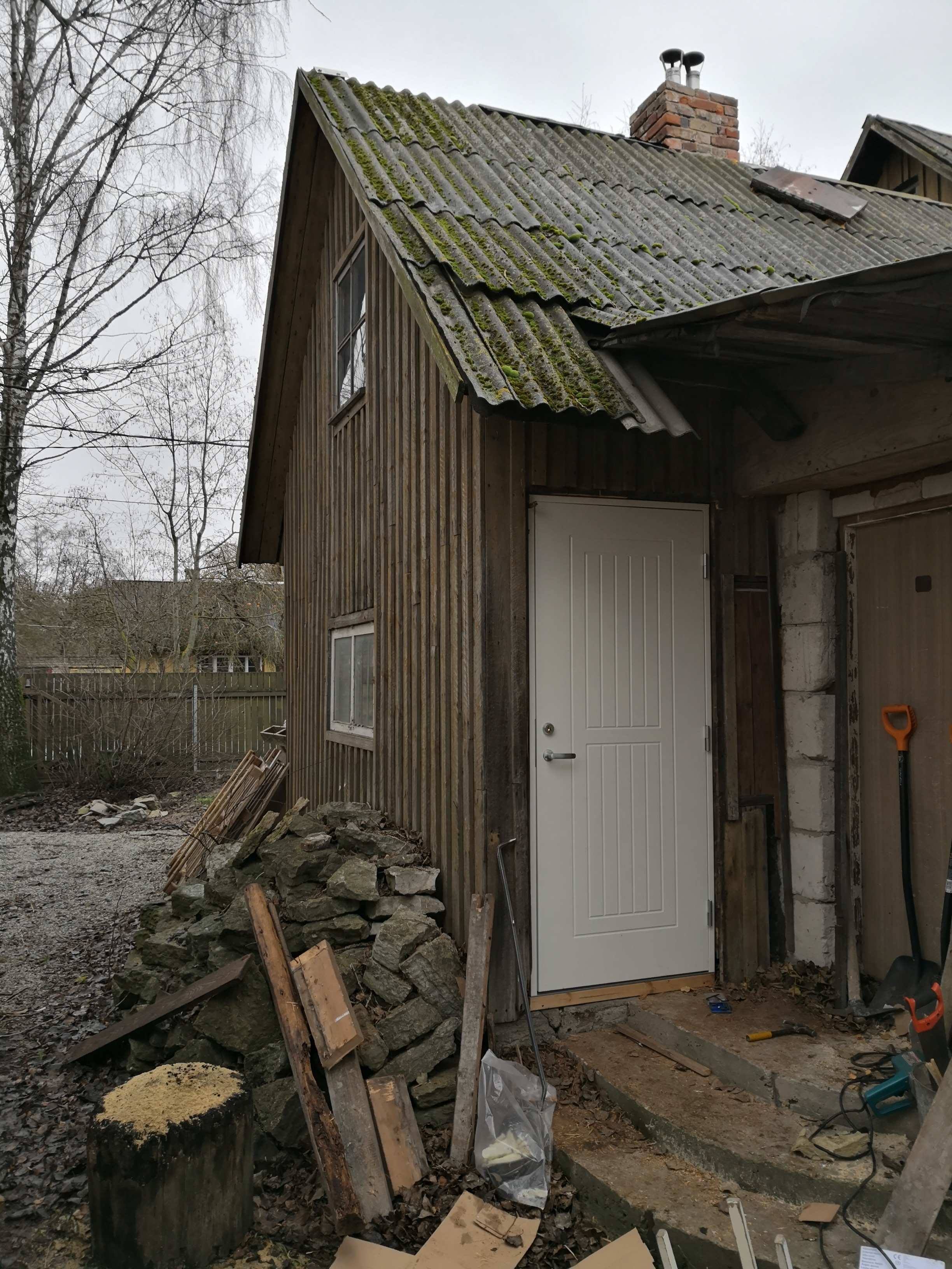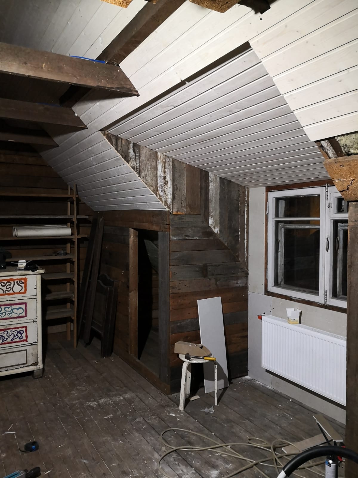 During the weekend there was a big spurt in productivity. On Saturday Mo and Mattias helped clean up the old floor that was still laying in the garden and on Sunday Mattias helped replacing the outside door from the utility room and after sunset I finished the ceiling in the bedroom and the wall in the northern bay window.