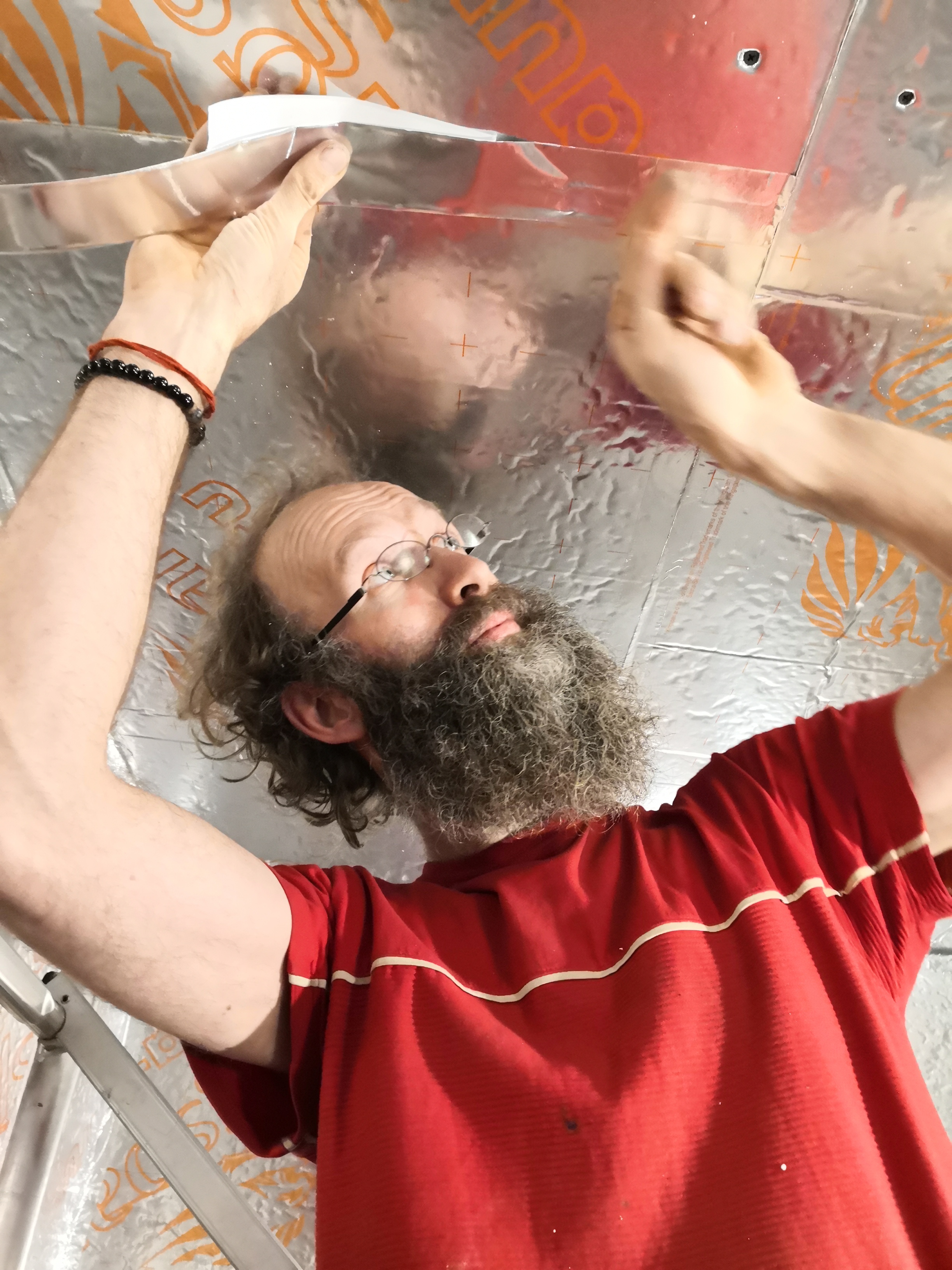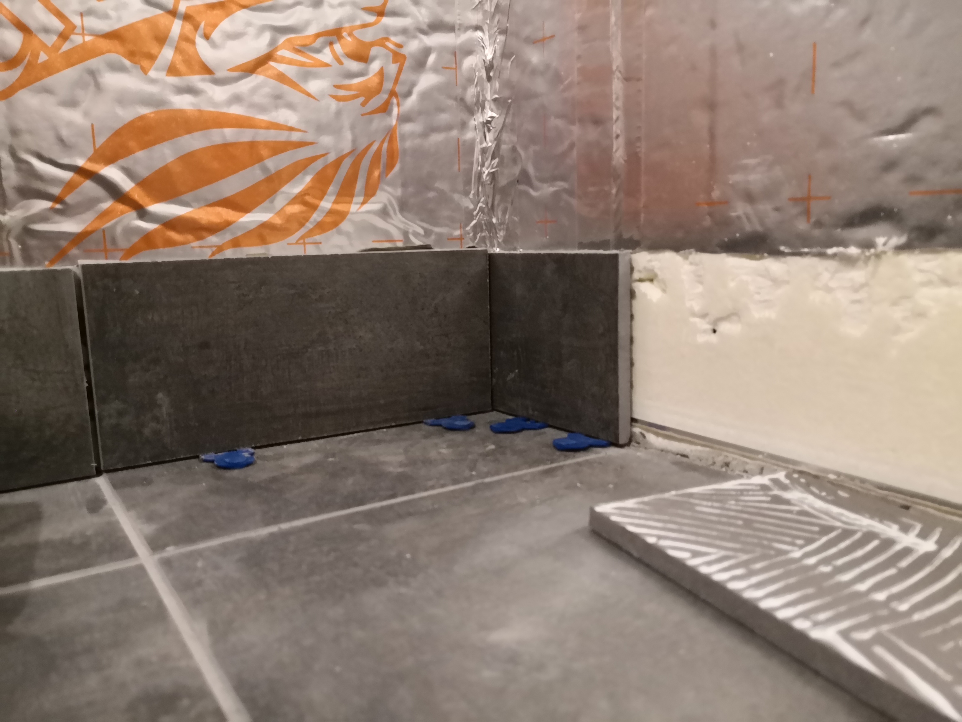 On Saturday I started with the tile baseboards to finish the floor. On Sunday I used aluminum tape tape to cover all the seams between the insulation plate and cover the screw holes. After this I could start adding a wood frame to the wall and ceiling that will hold the weatherboards. A nice start of the holiday season!
